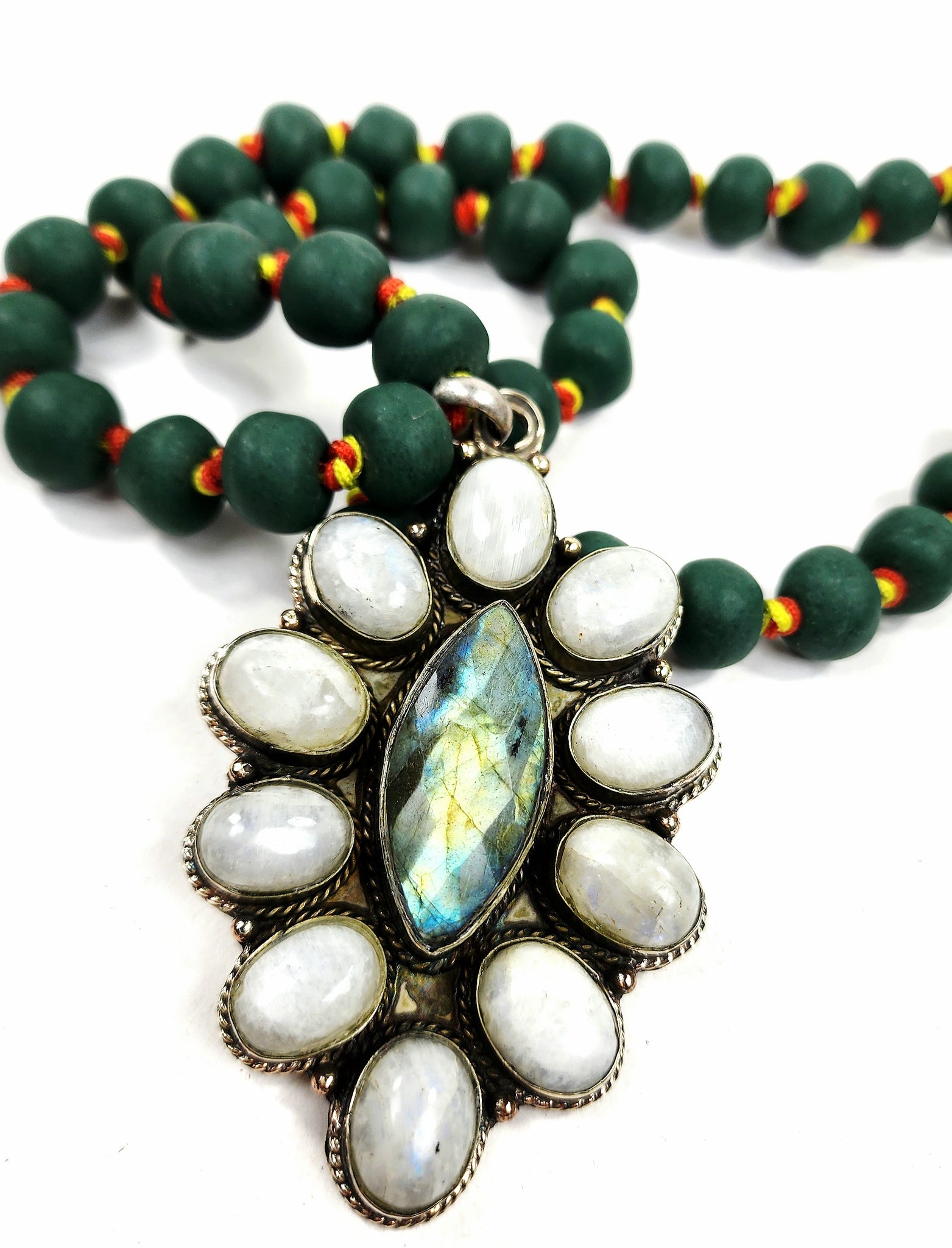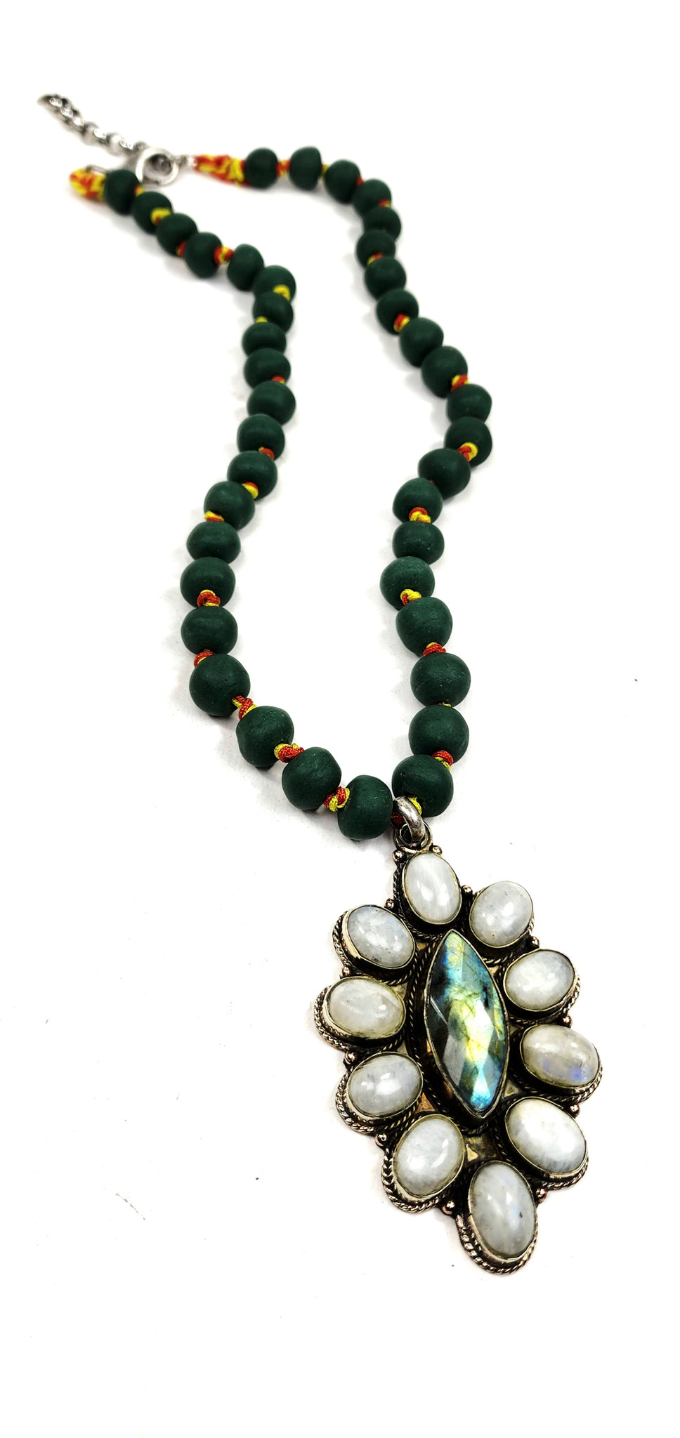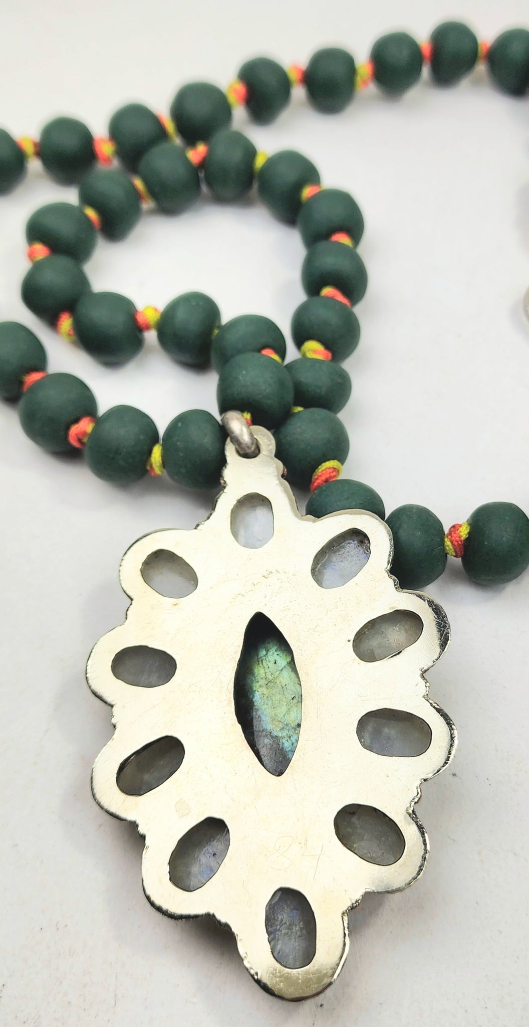 Opaque green glass beads knotted with orange and lime green nylon with a labradorite/rainbow moonstone pendant