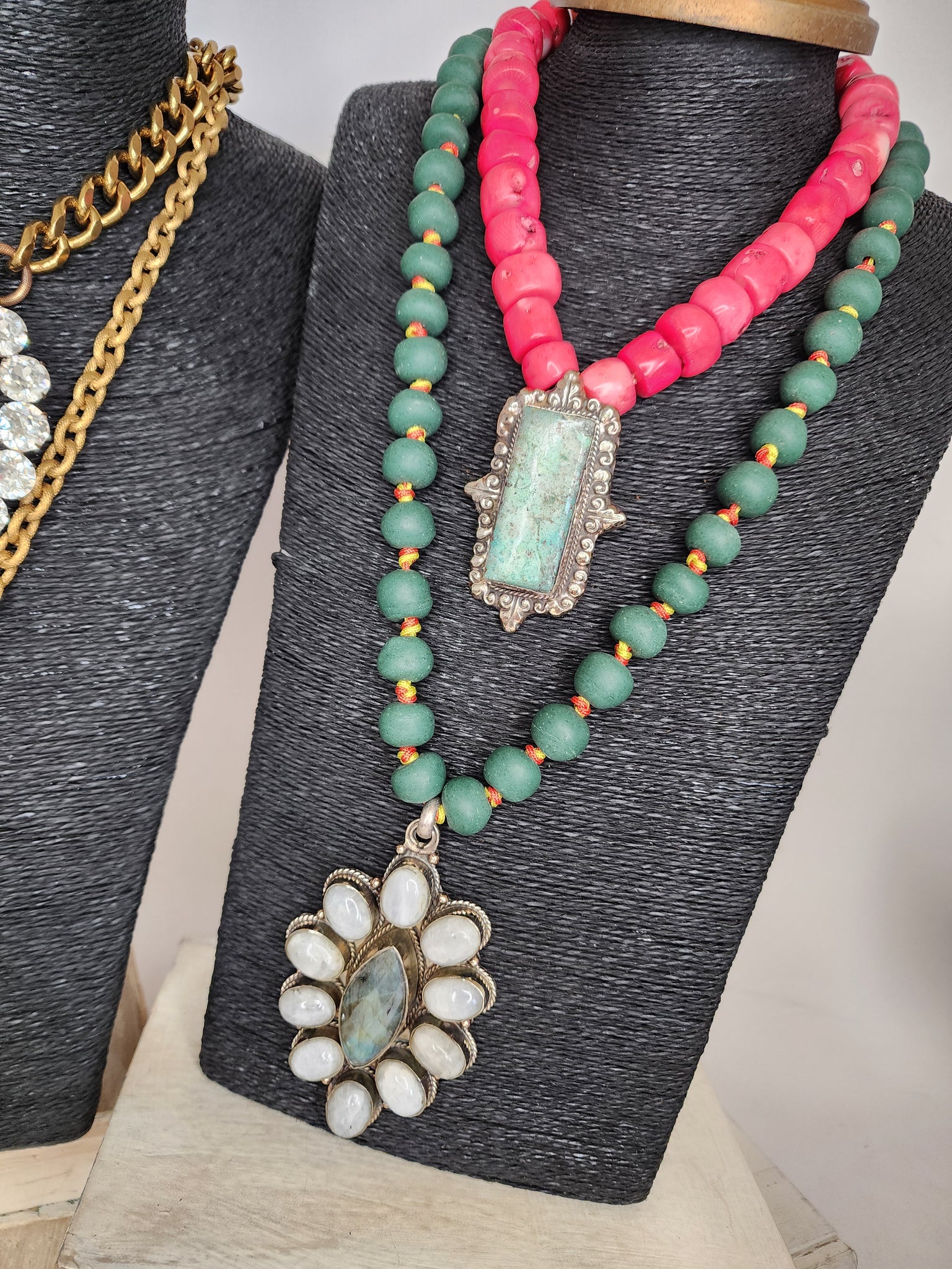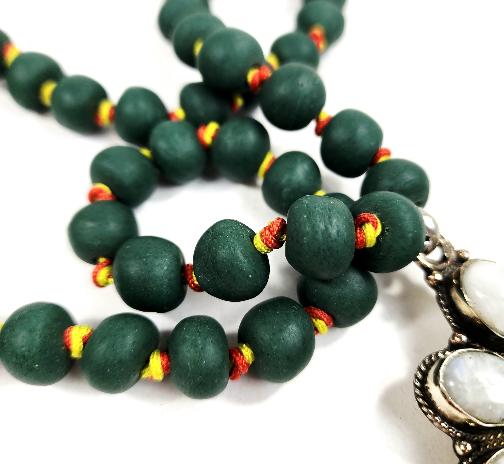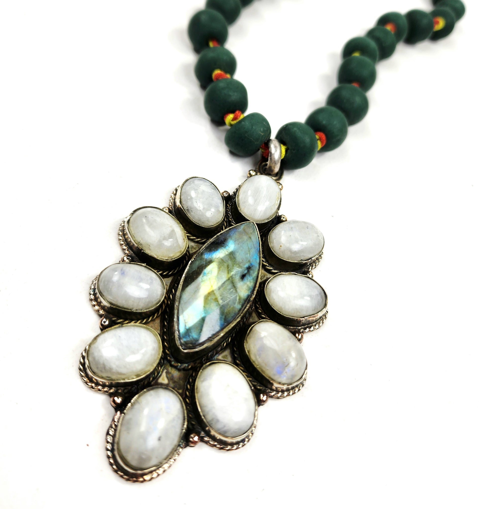 Opaque green glass beads knotted with orange and lime green nylon with a labradorite/rainbow moonstone pendant