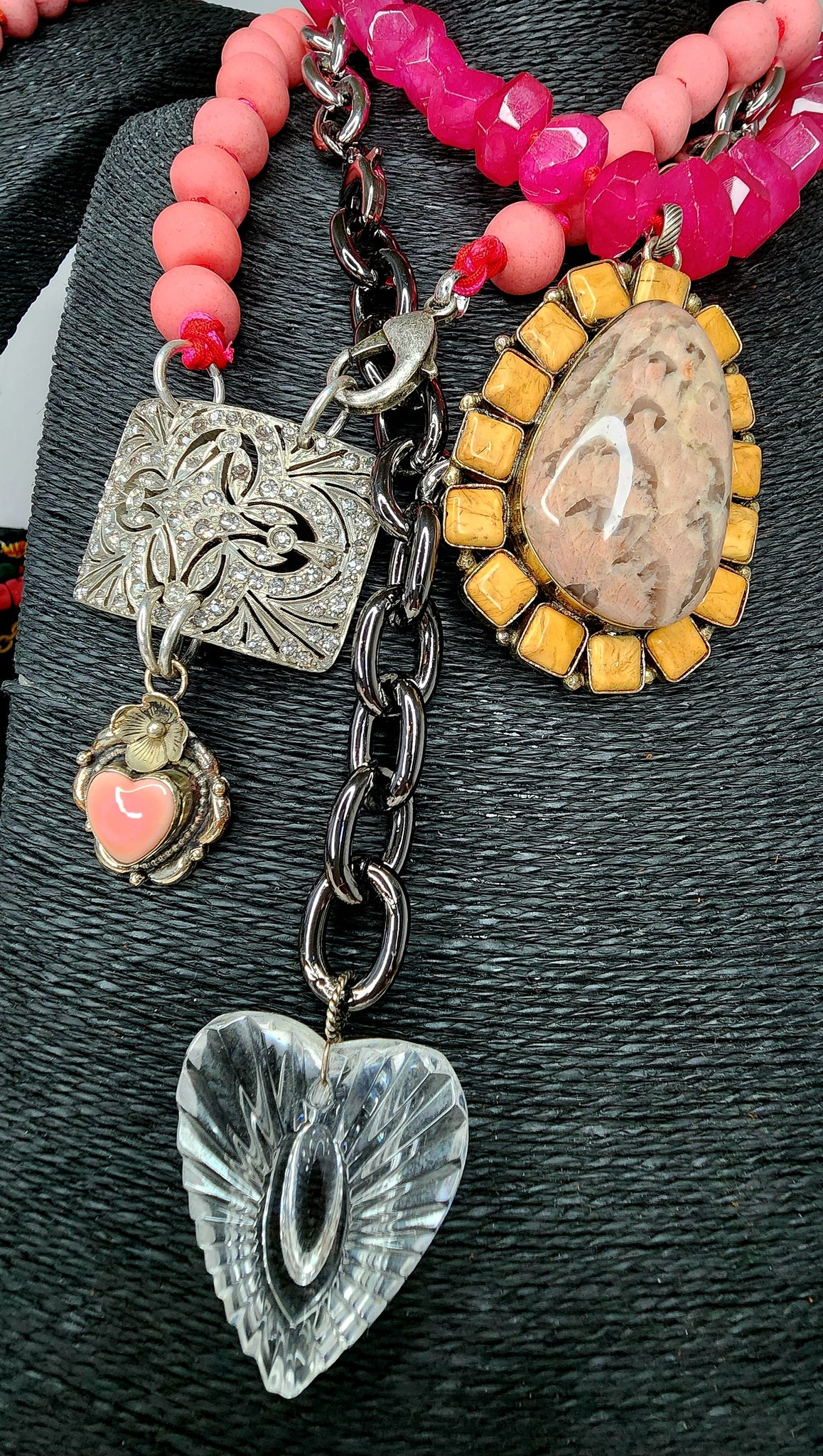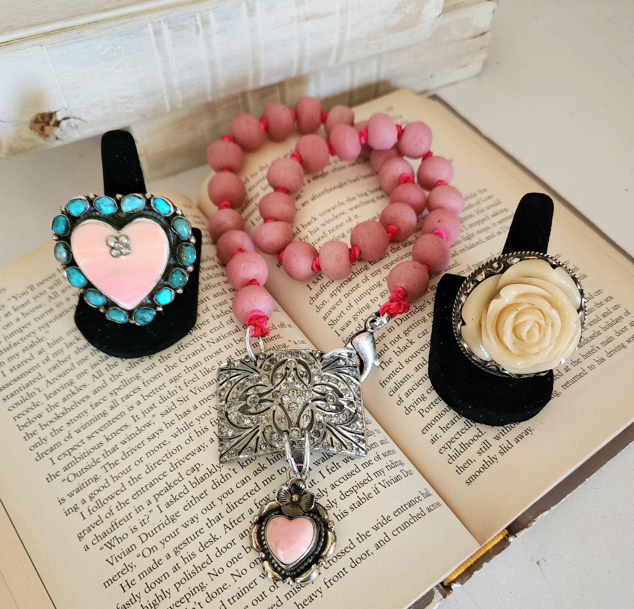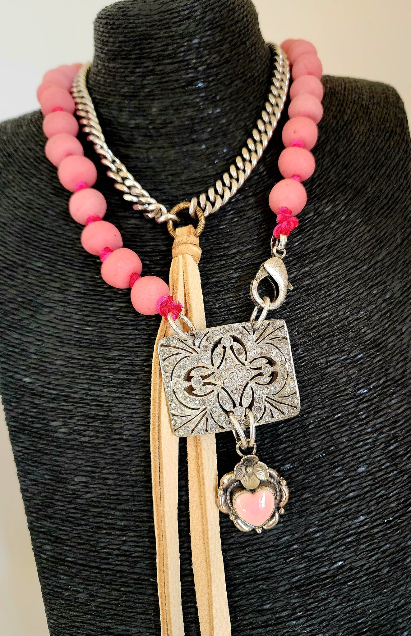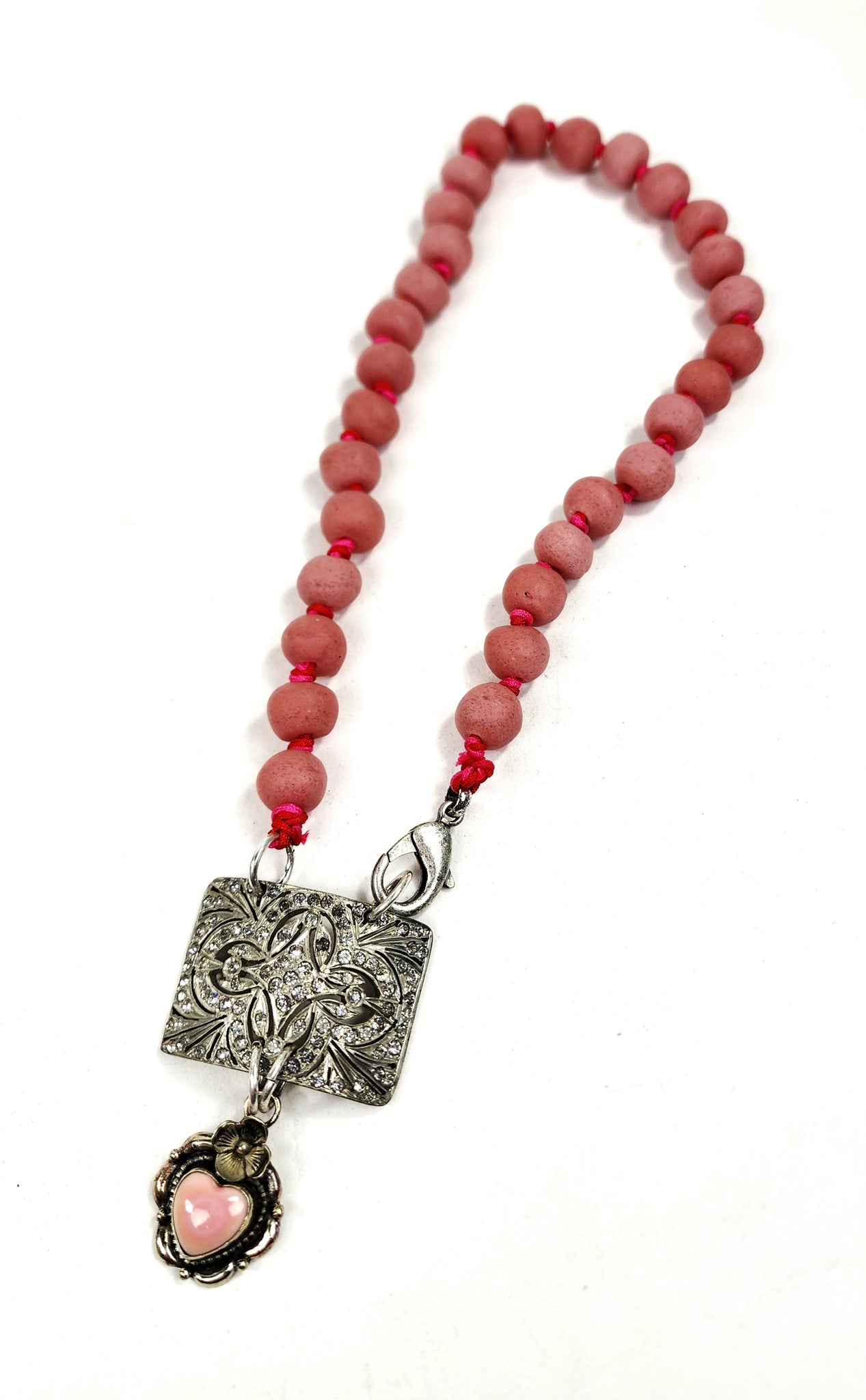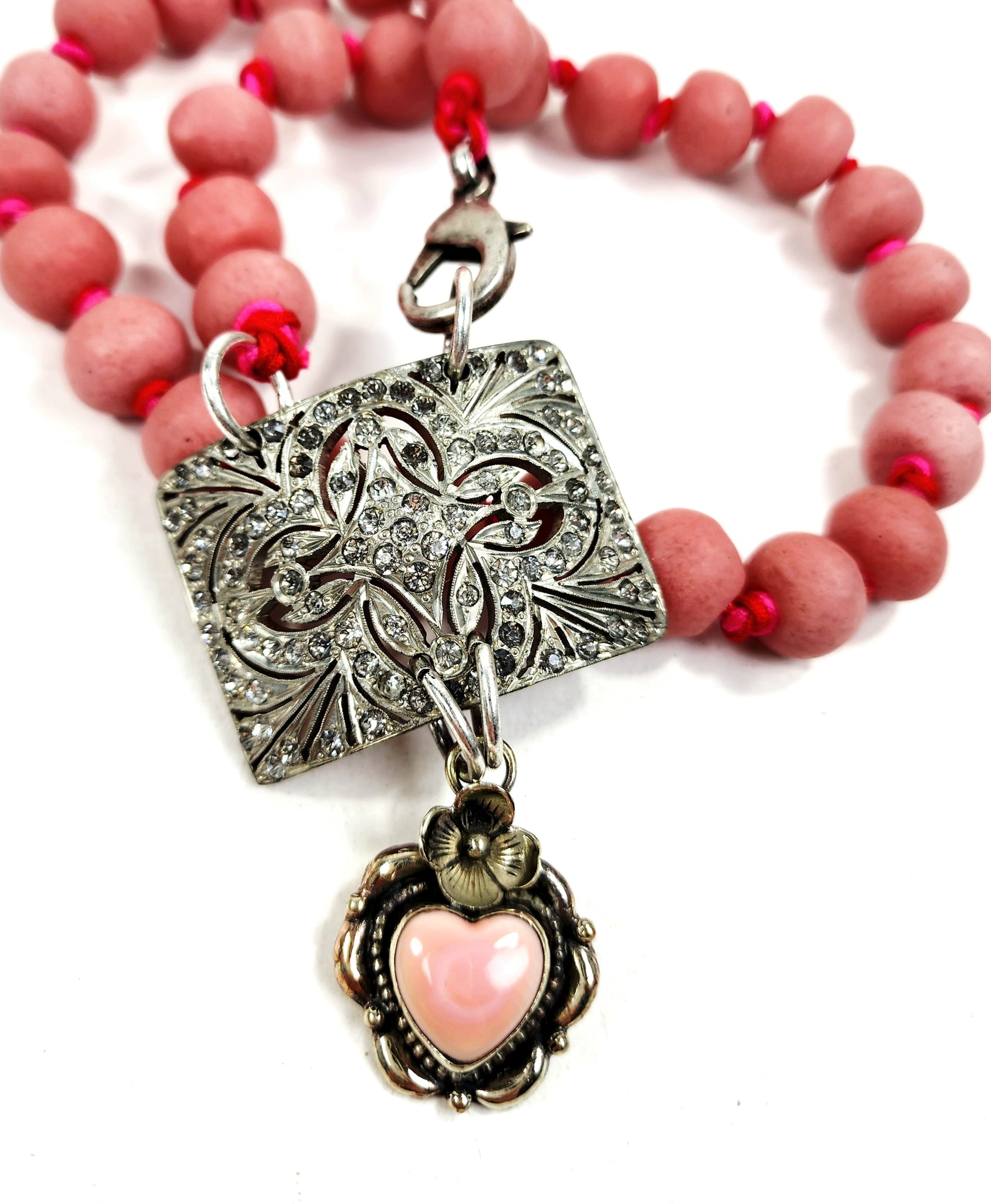 Vintage shoe buckle and silver/pink conch shell heart on opaque pink glass beads knotted on red/pink nylon