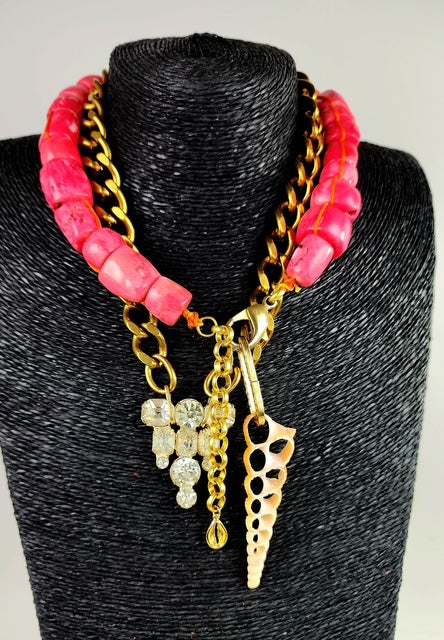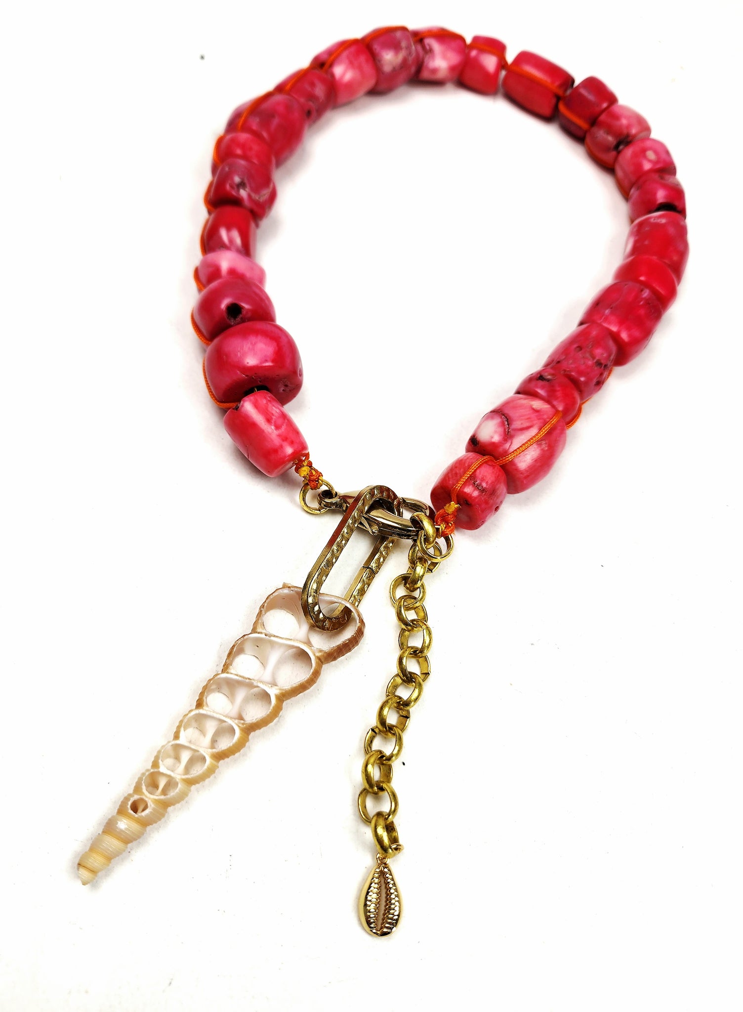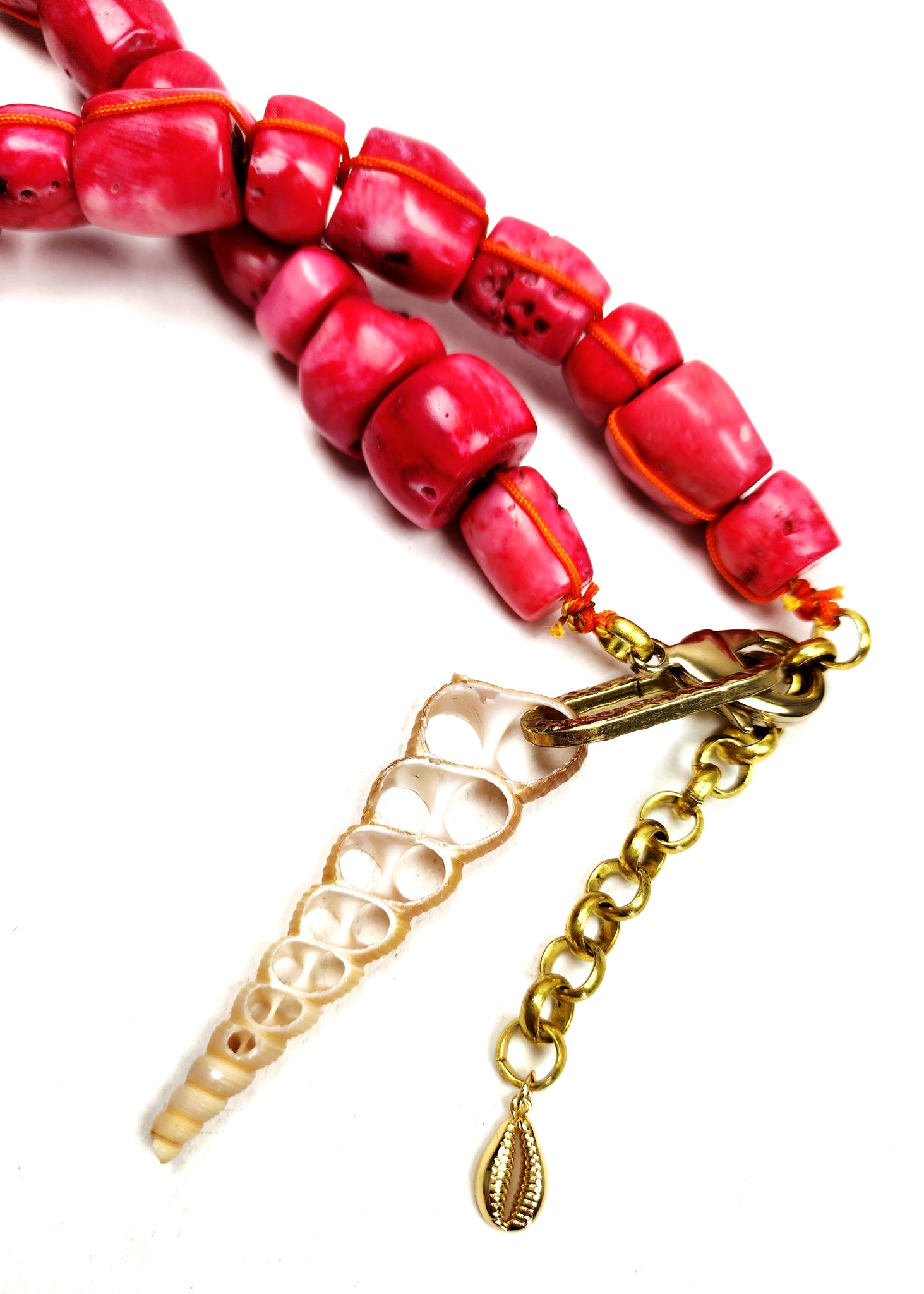 Pink coral knotted with orange nylon .