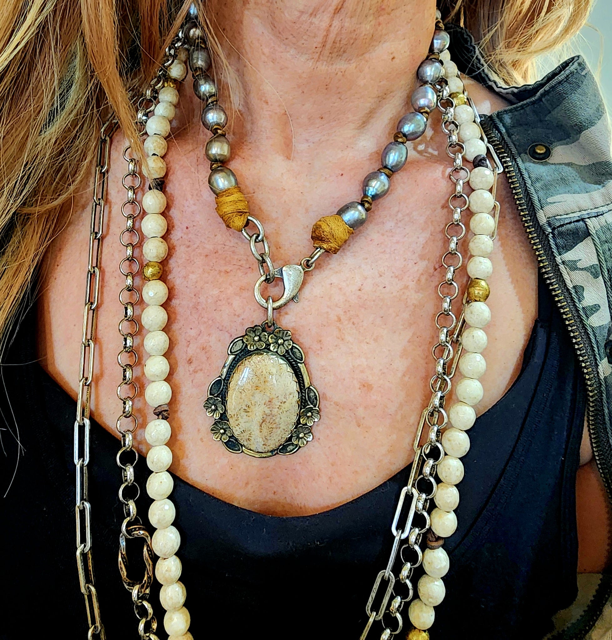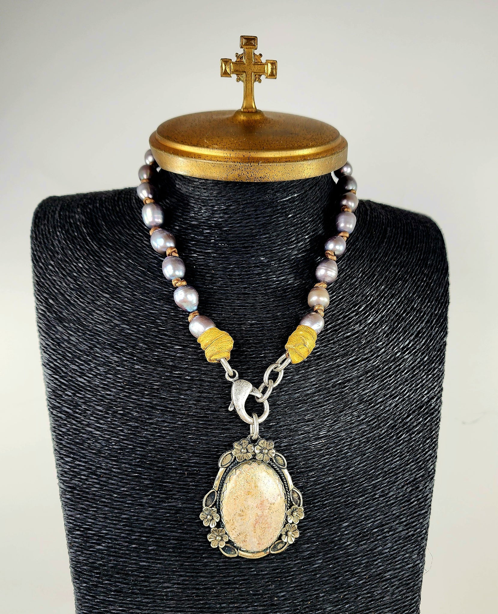 Medium Grey freshwater pearls handknotted on leather with a silver/fossil Jade pendant