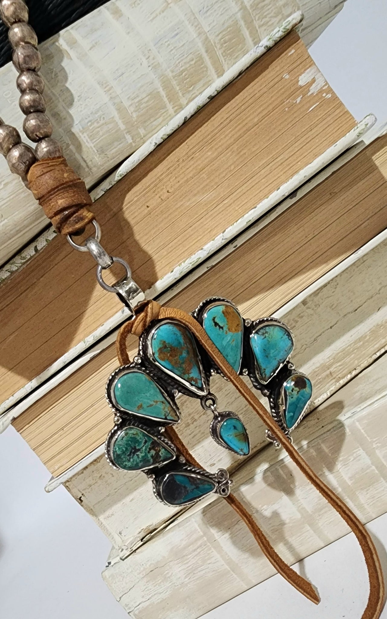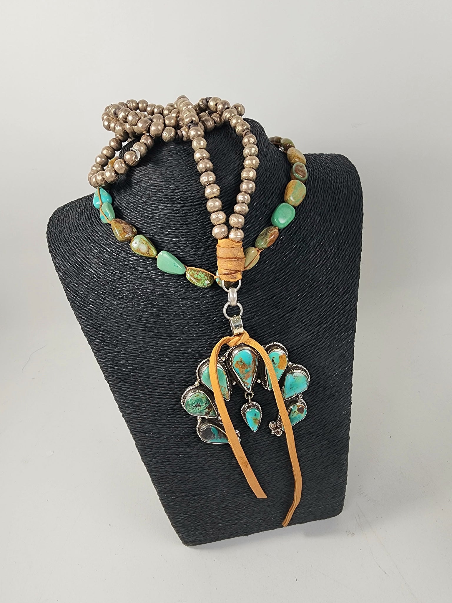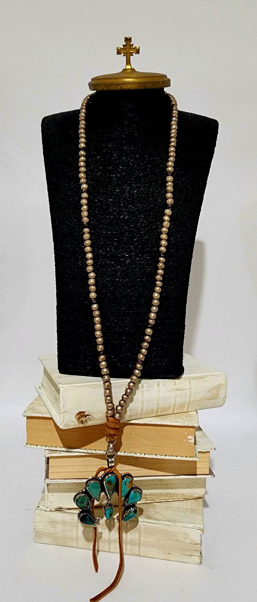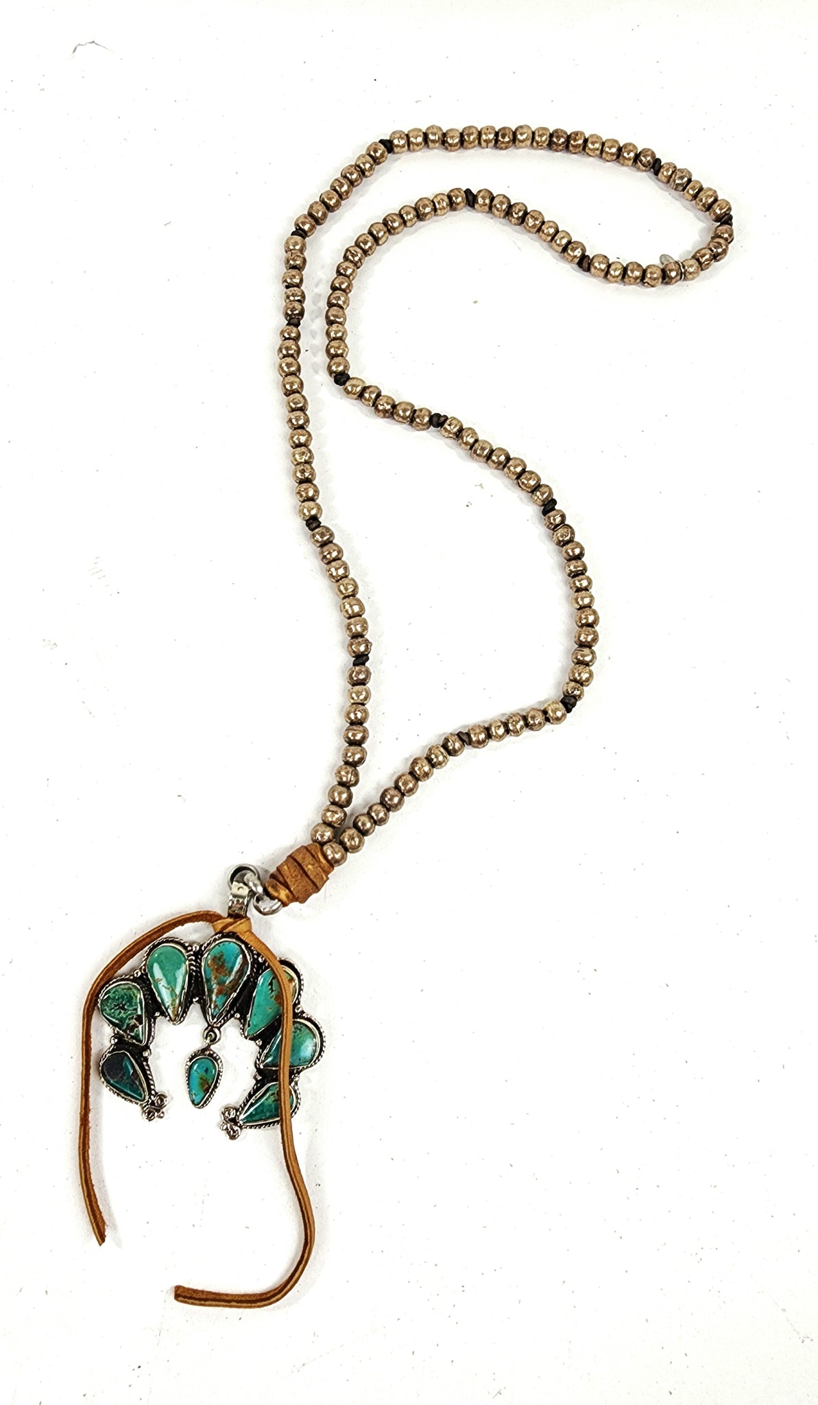 Vintage silver metal beads knotted on leather with turquoise and silver squash blossom pendant