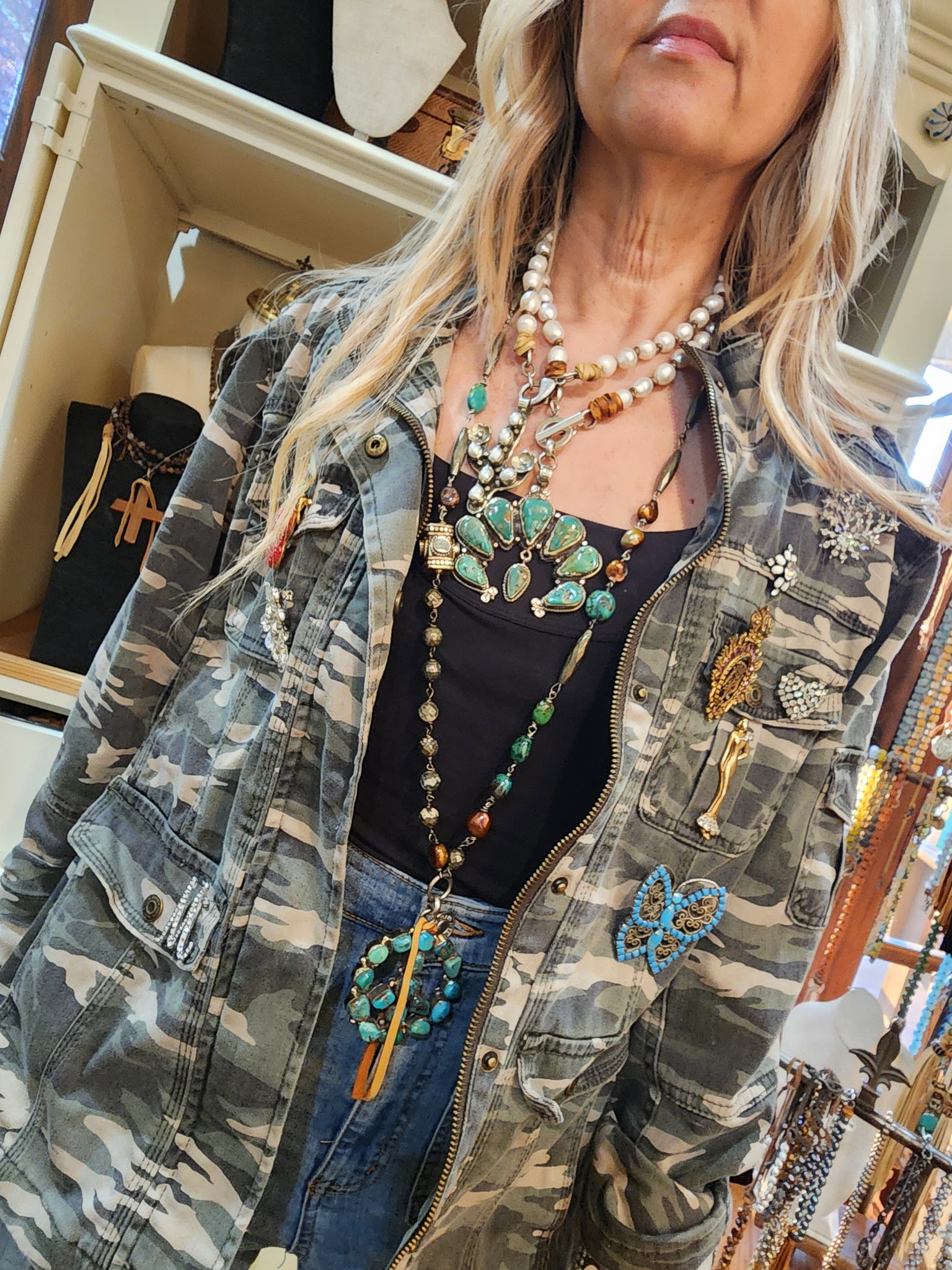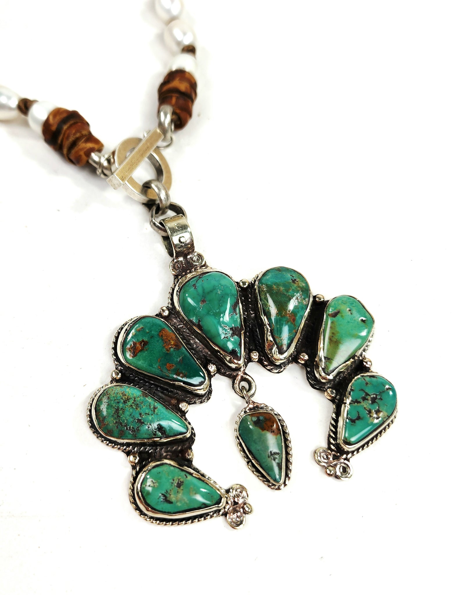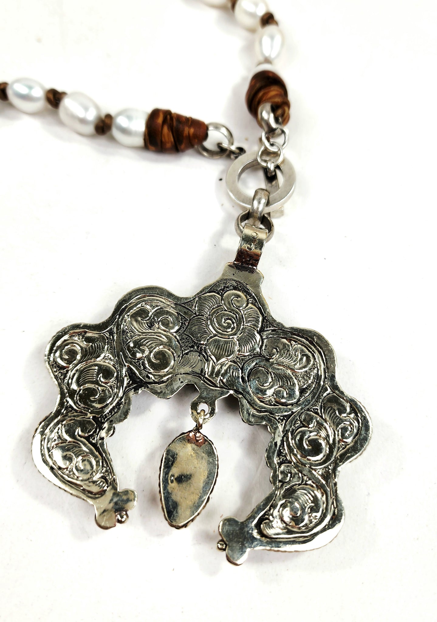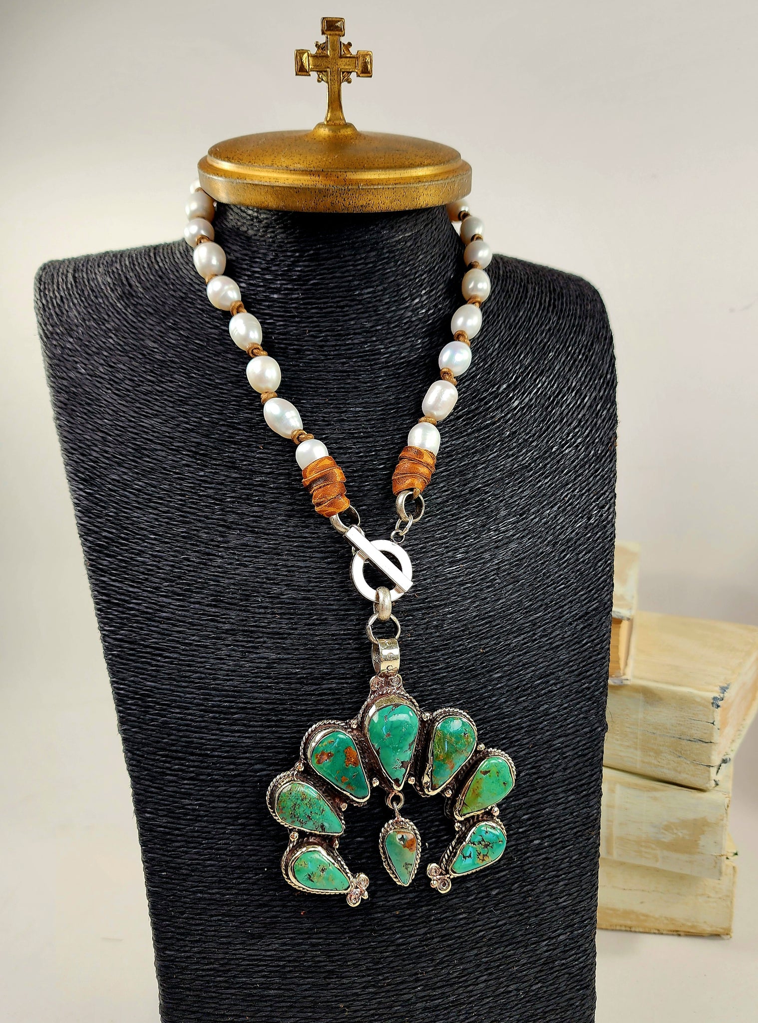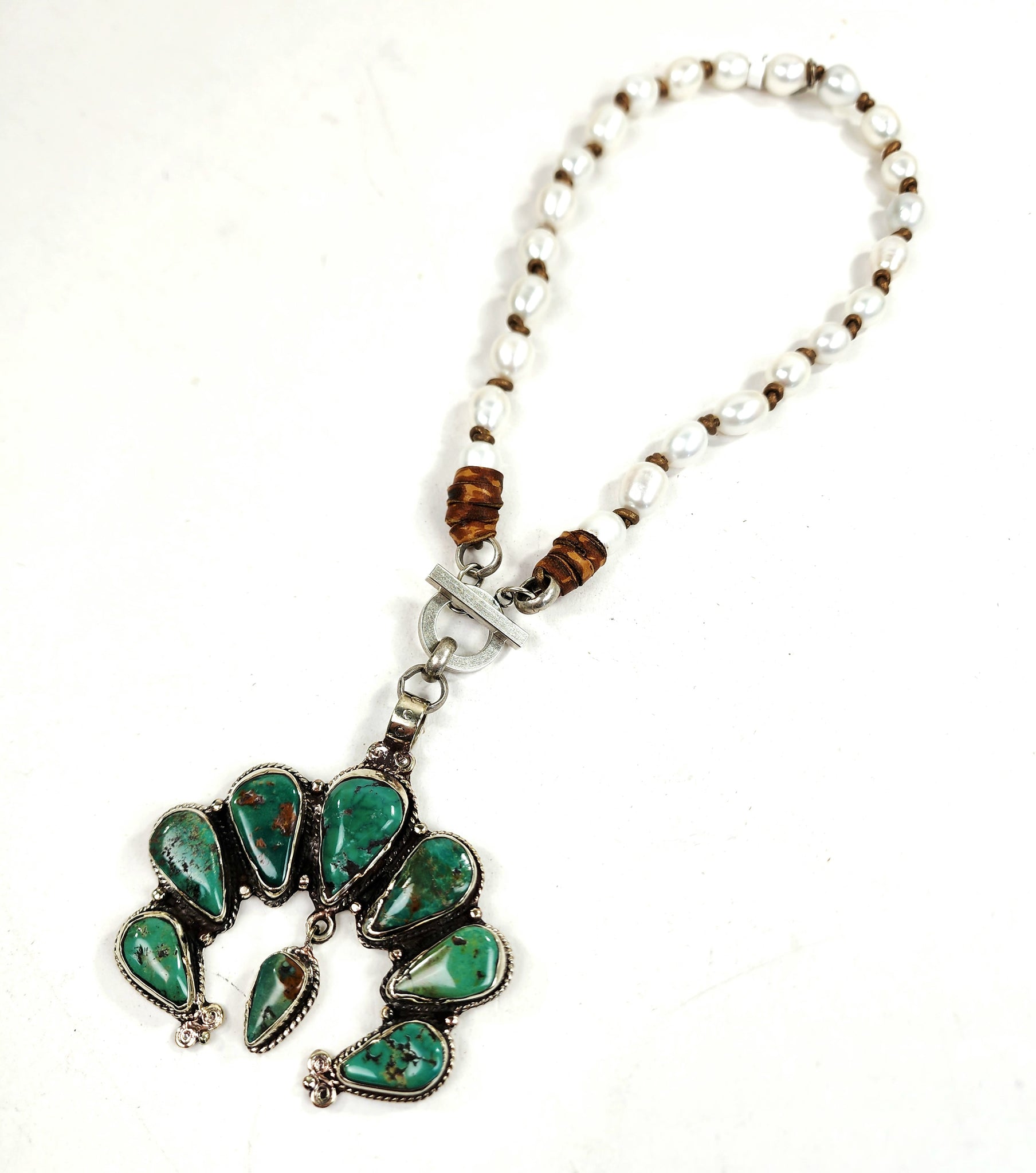 White freshwater pearls hand knotted on leather w/ toggle clasp and silver/turquoise squash blossom pendant