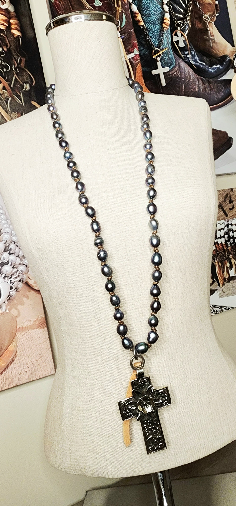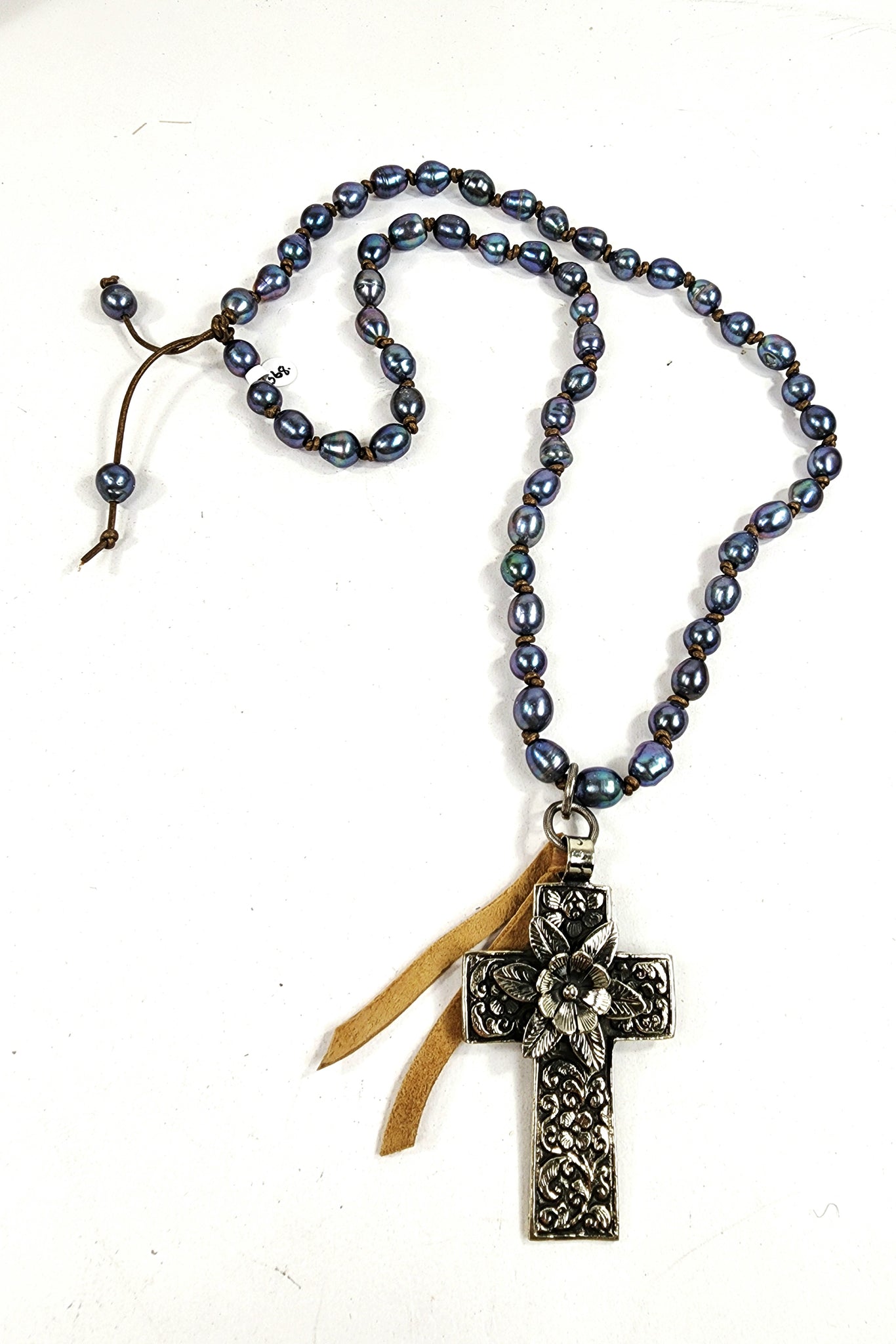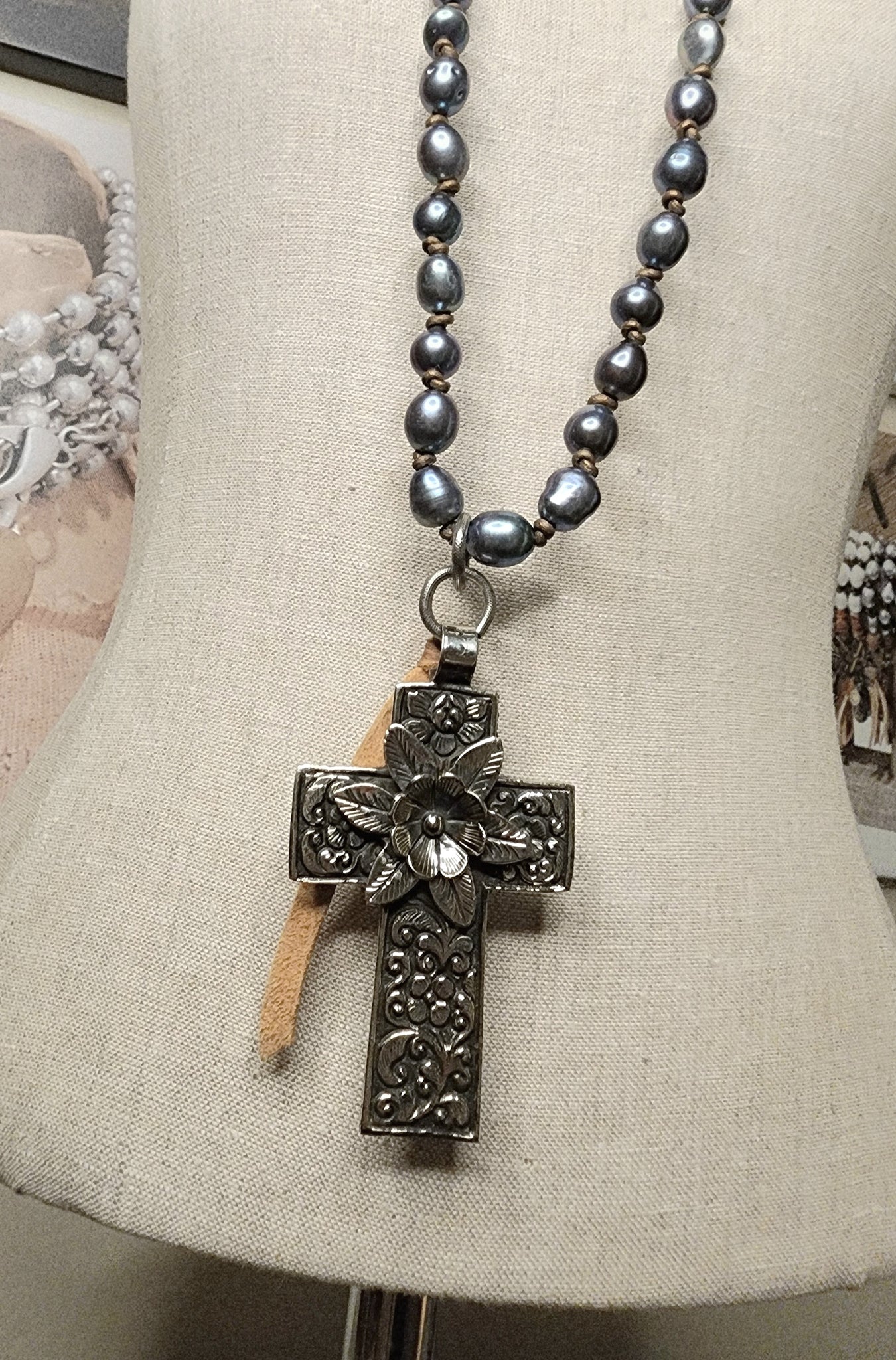 Large peacock color pearls on handknotted leather with large detailed silver cross