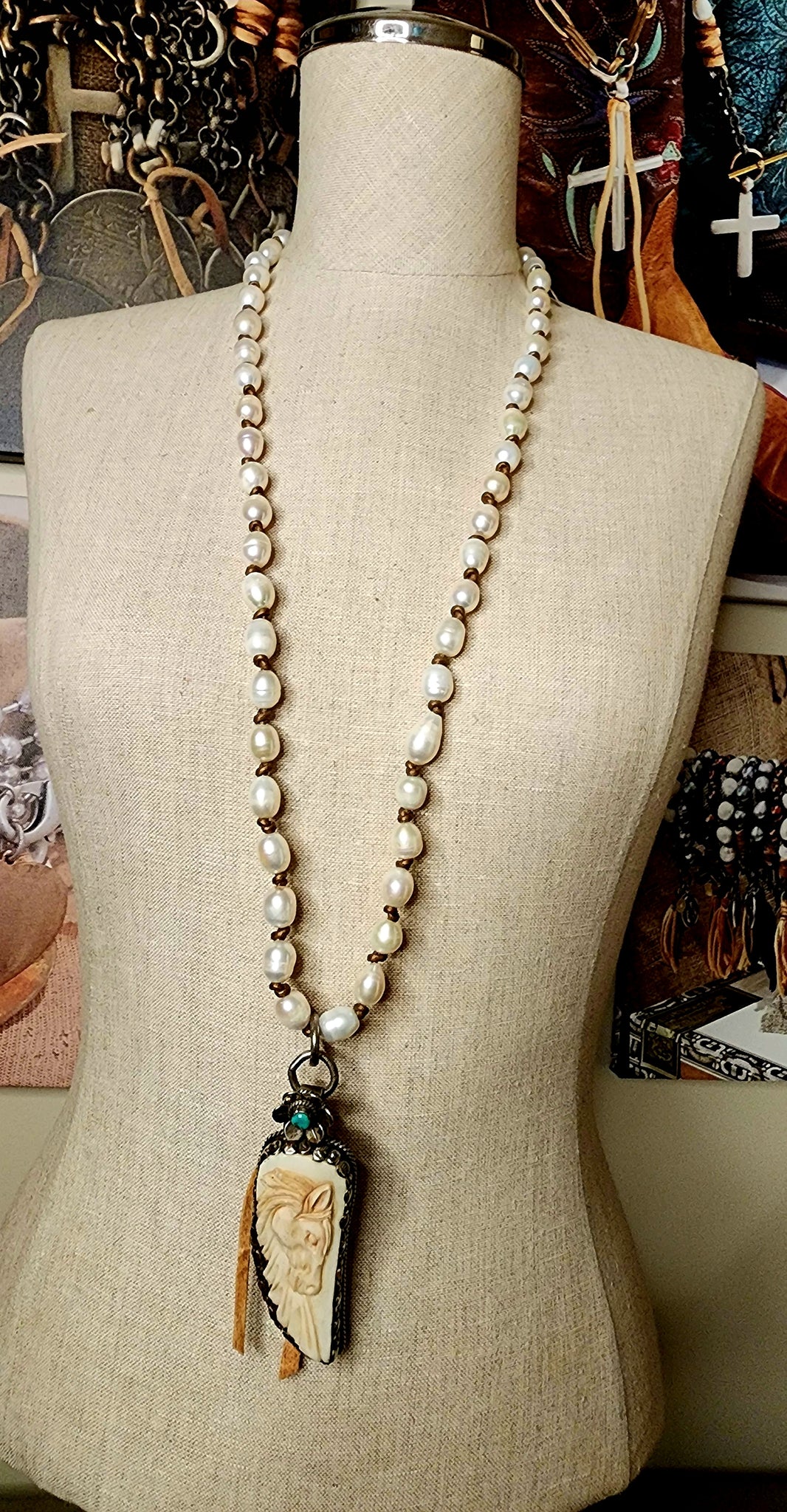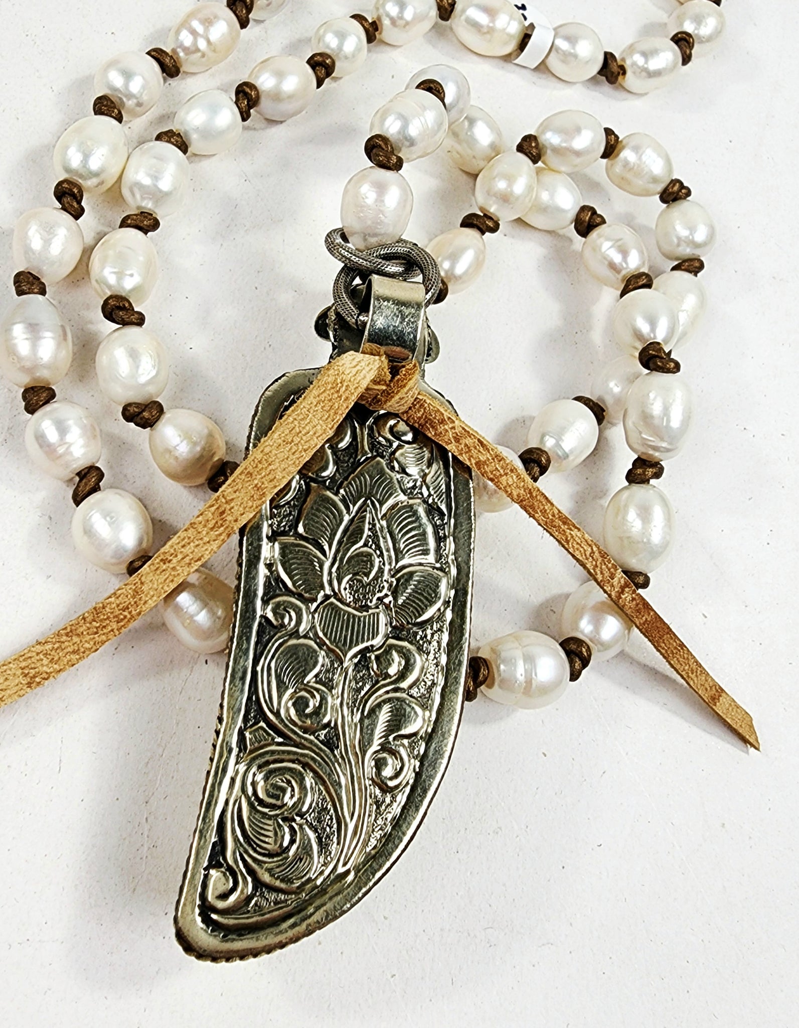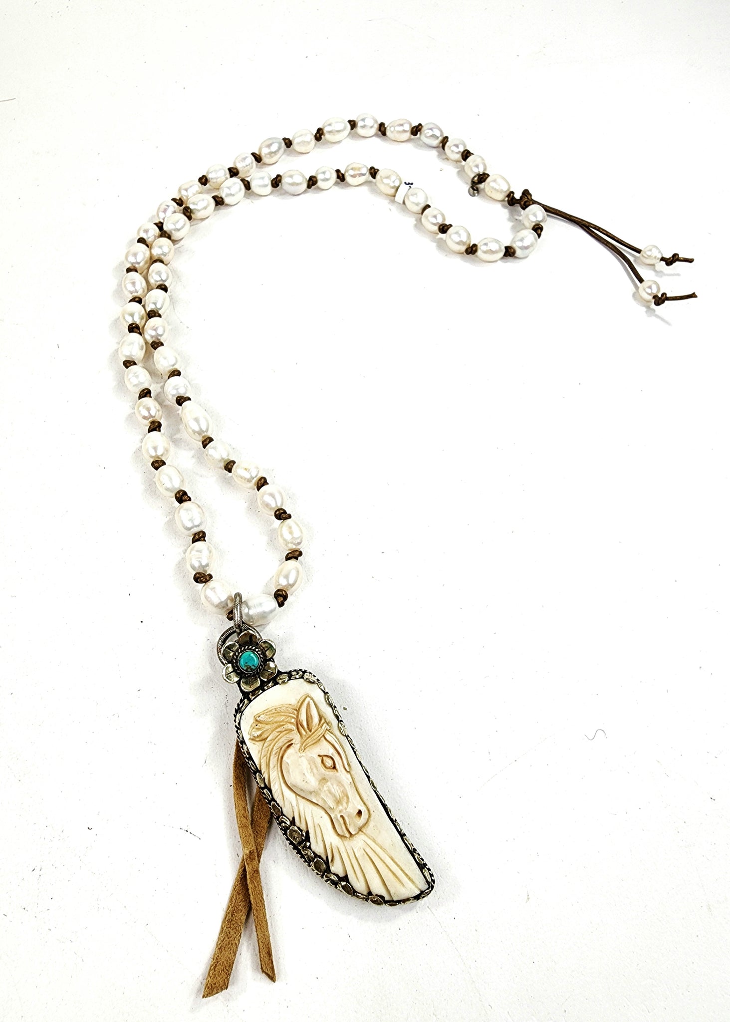 Handknotted pearls on leather with silver/carved bone/turquoise pendant.