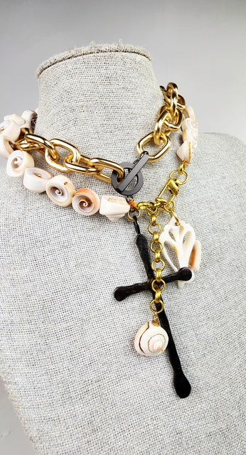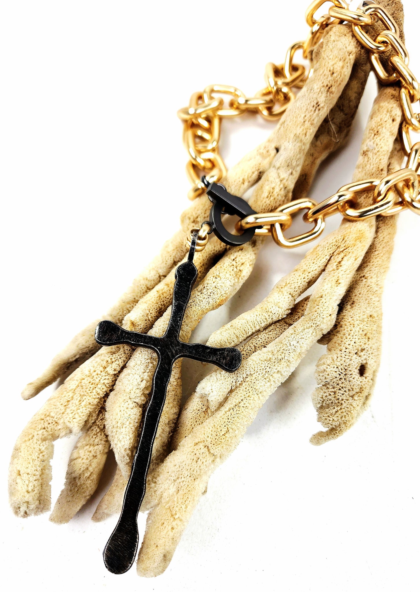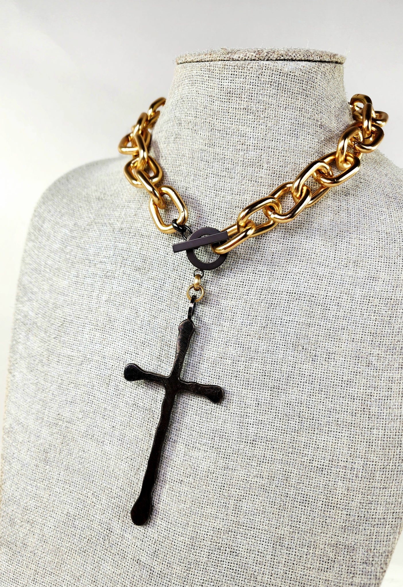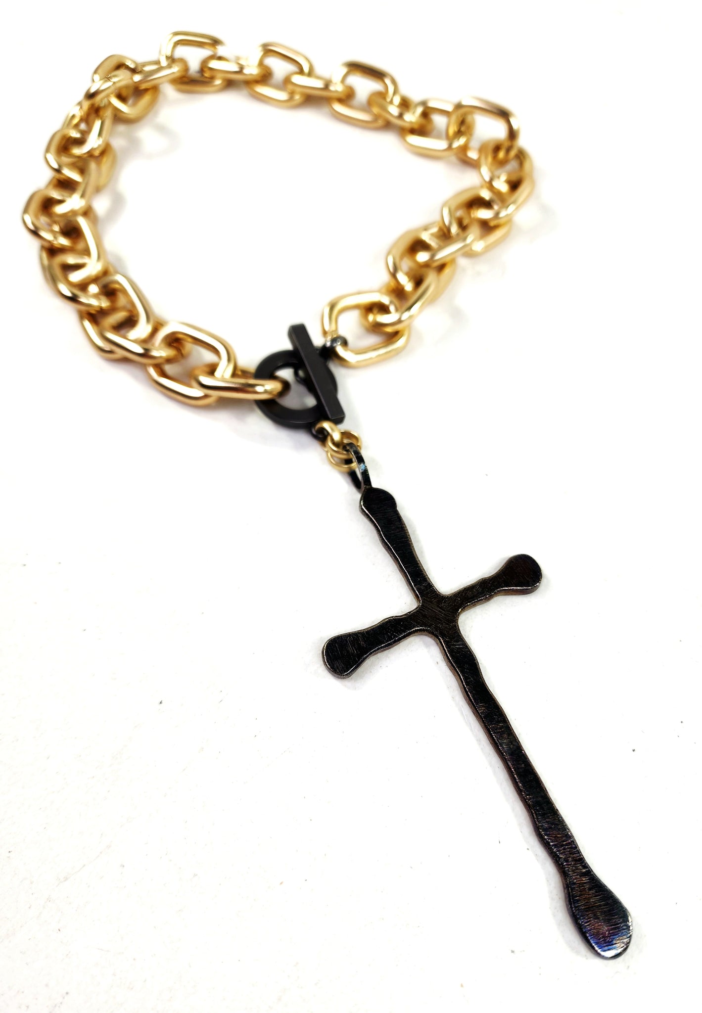 Large matte gold, aluminum link chain with matte gunmetal toggle clasp and gunmetal Cross pendant.