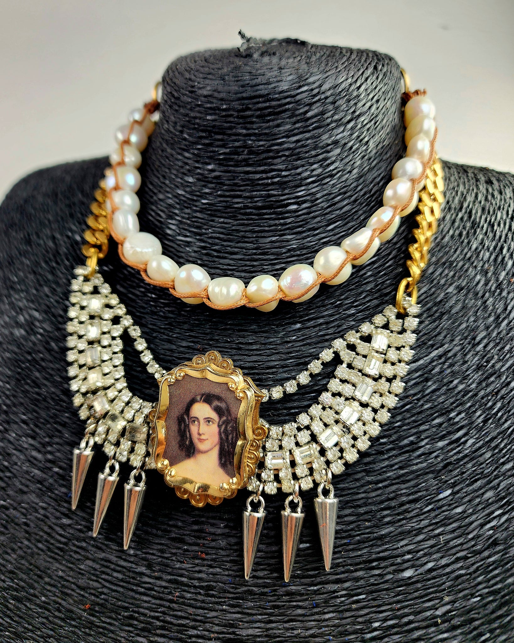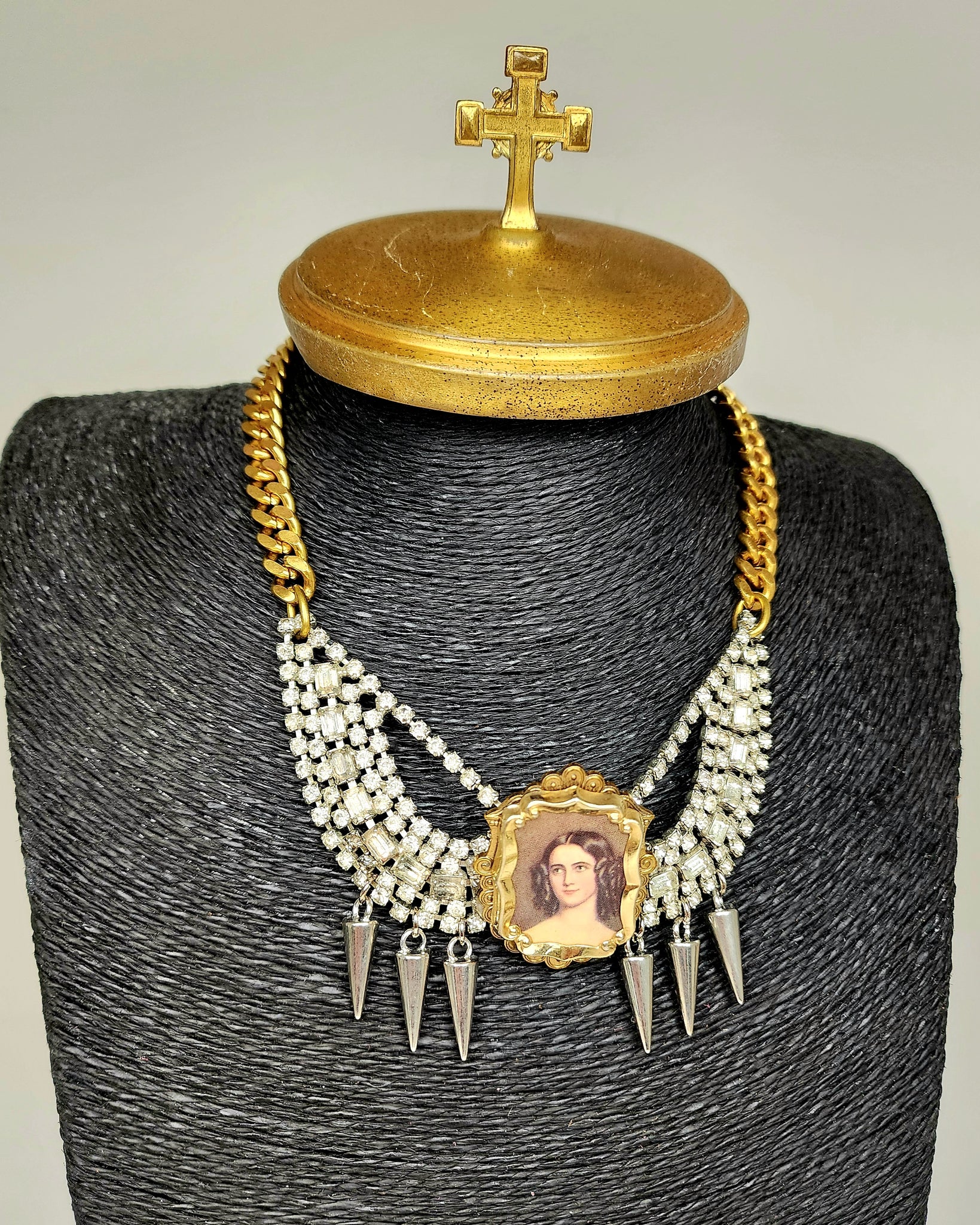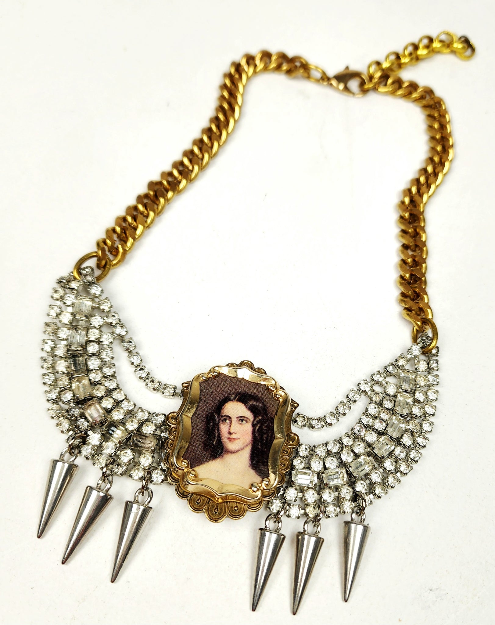 Vintage rhinestones with a vintage portrait and spikes on solid brass chain