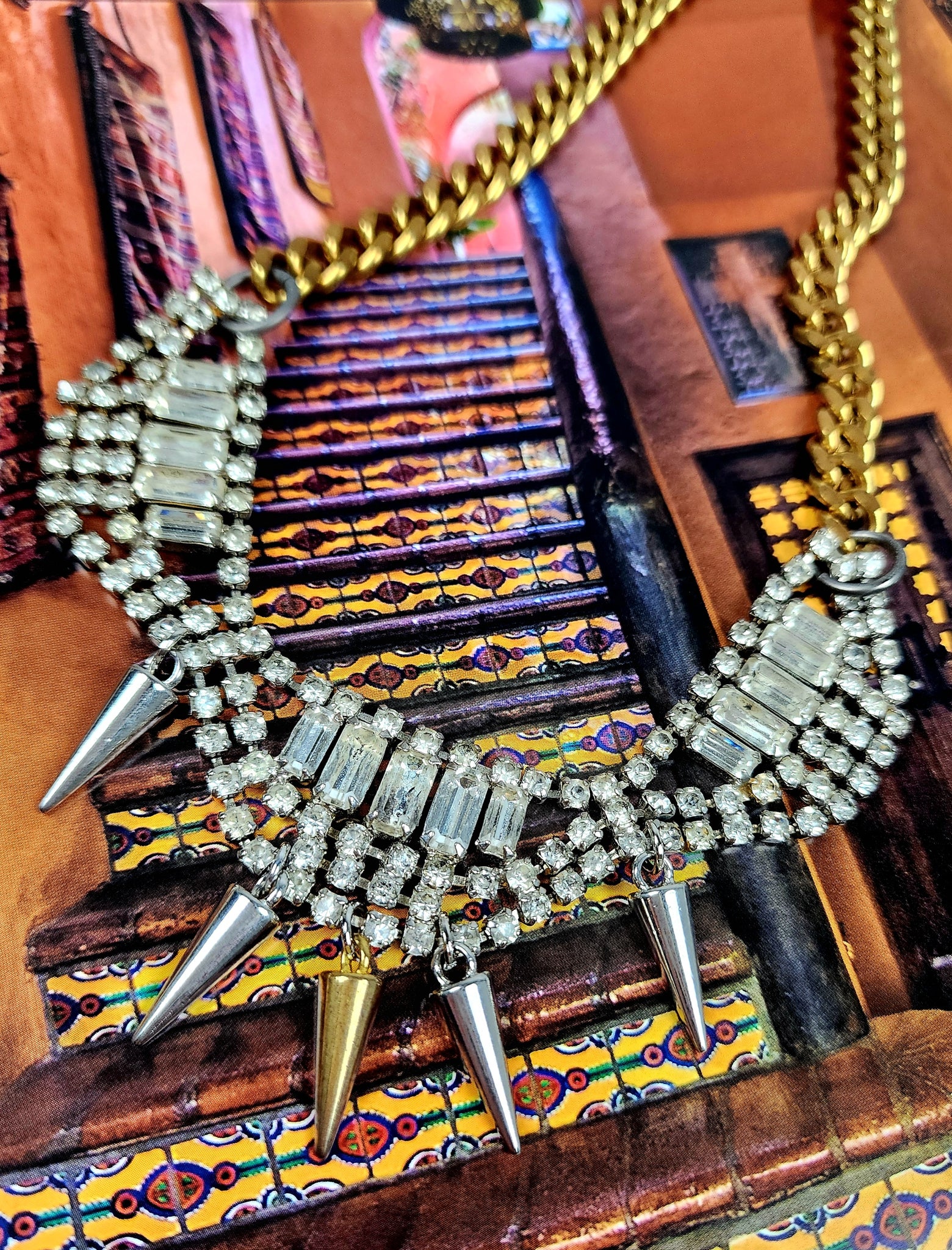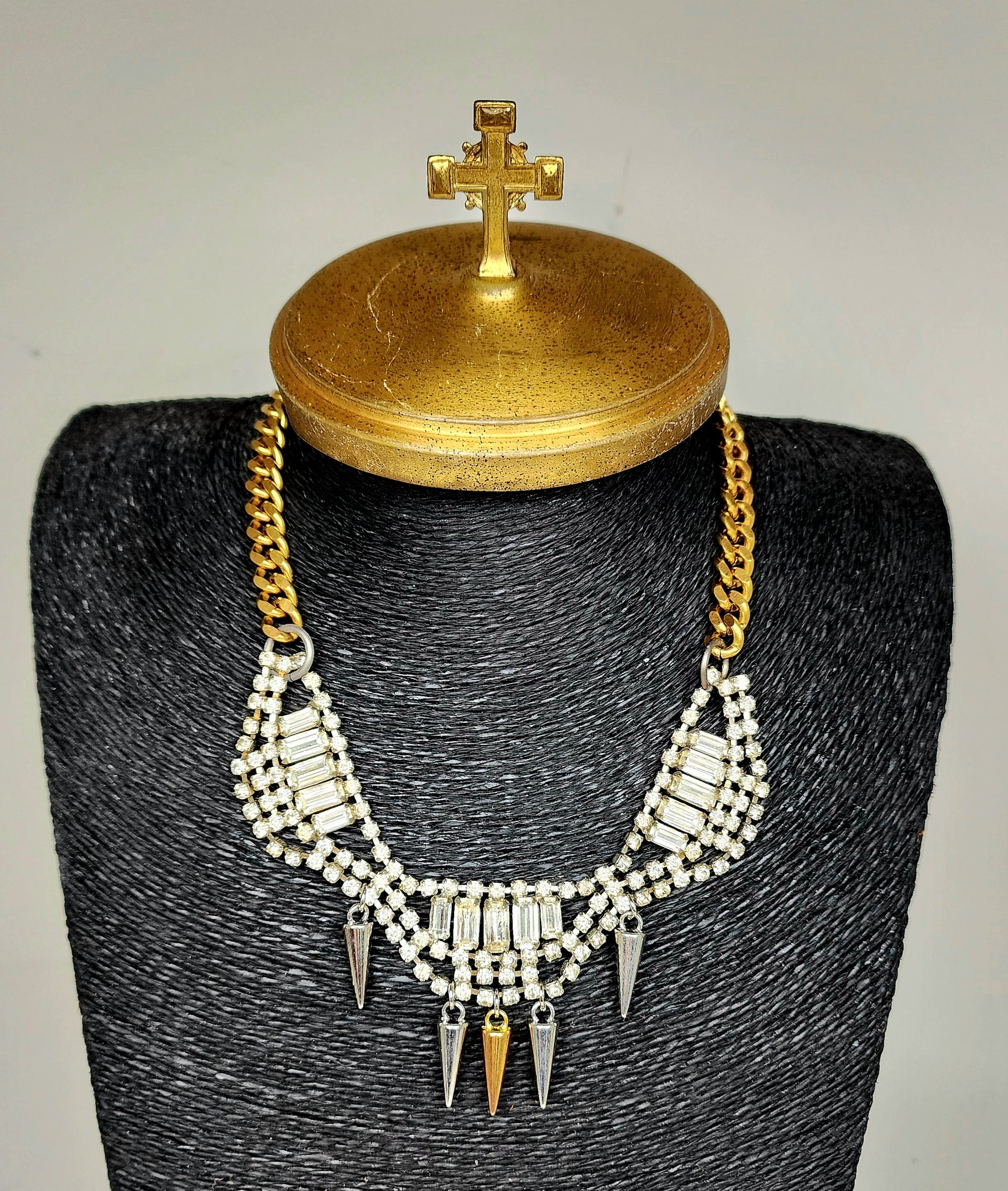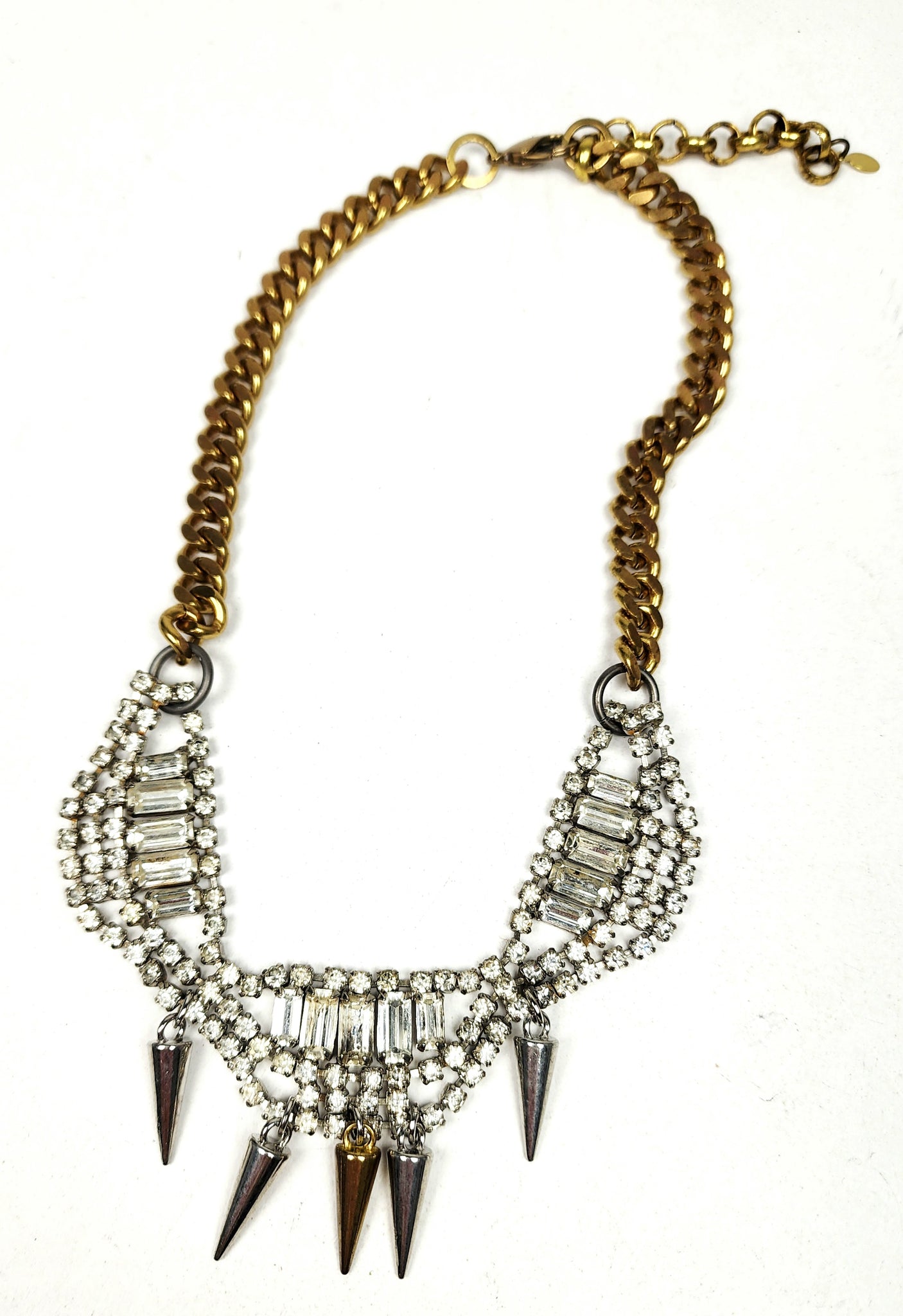 Vintage rhinestones and spikes with solid brass chain.