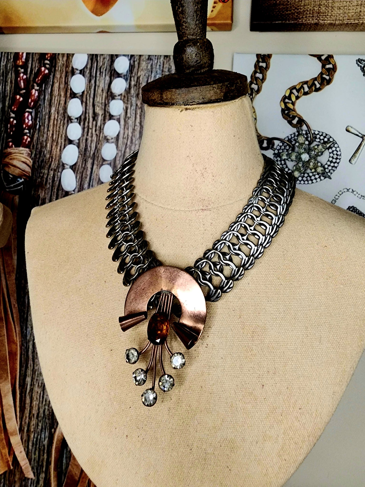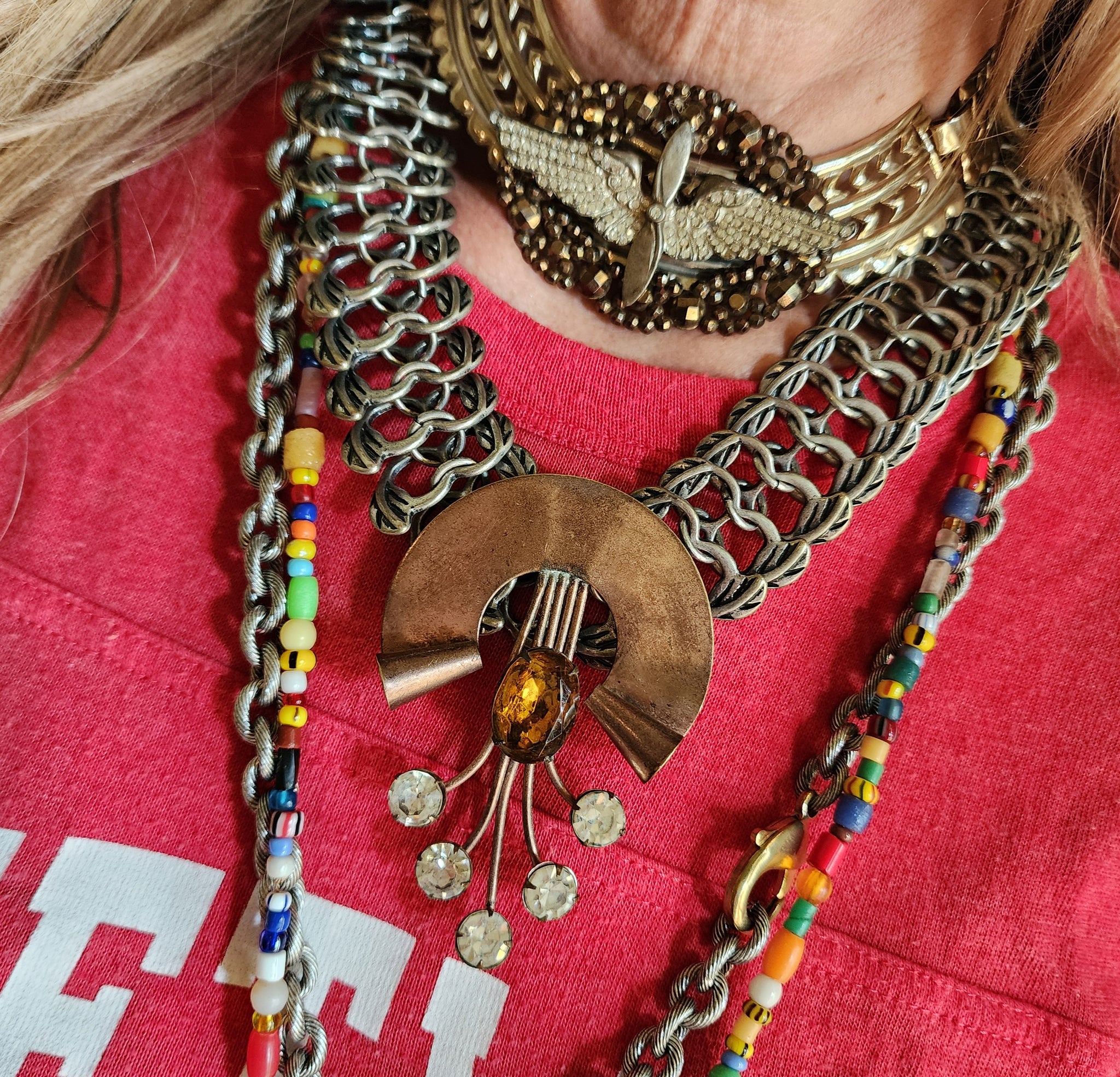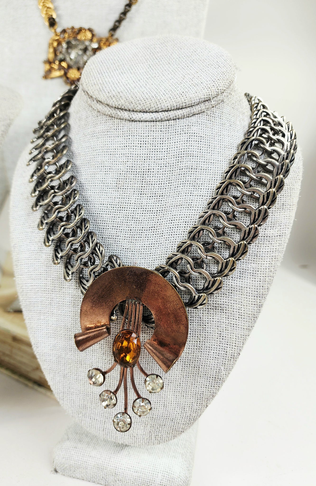 Large clear crystals and extra large faceted amber crystal on silver collar chain
