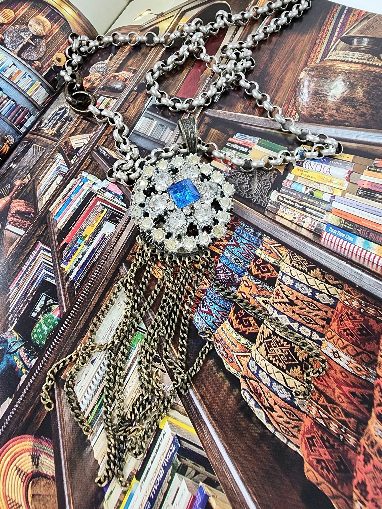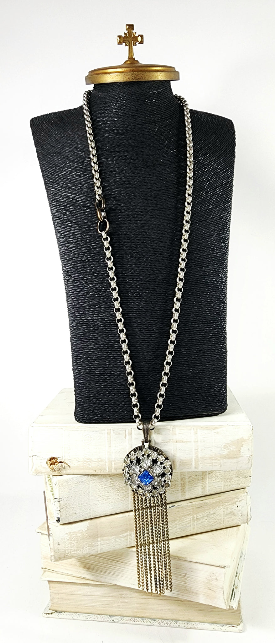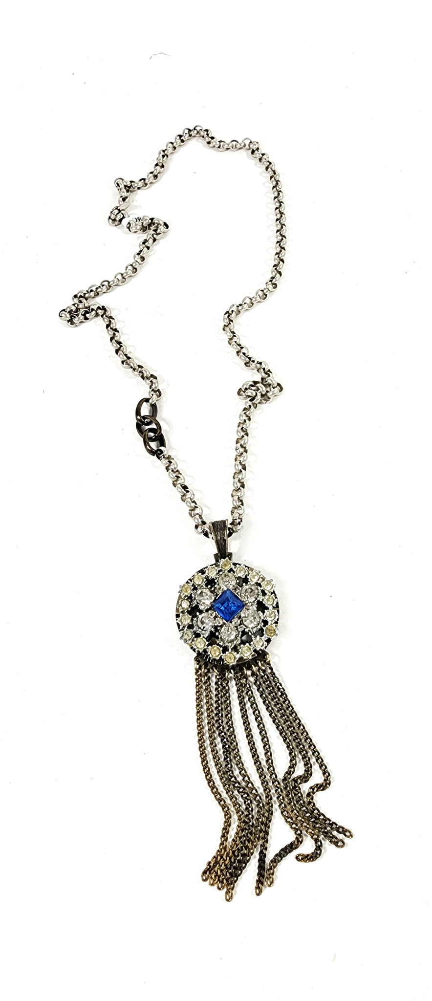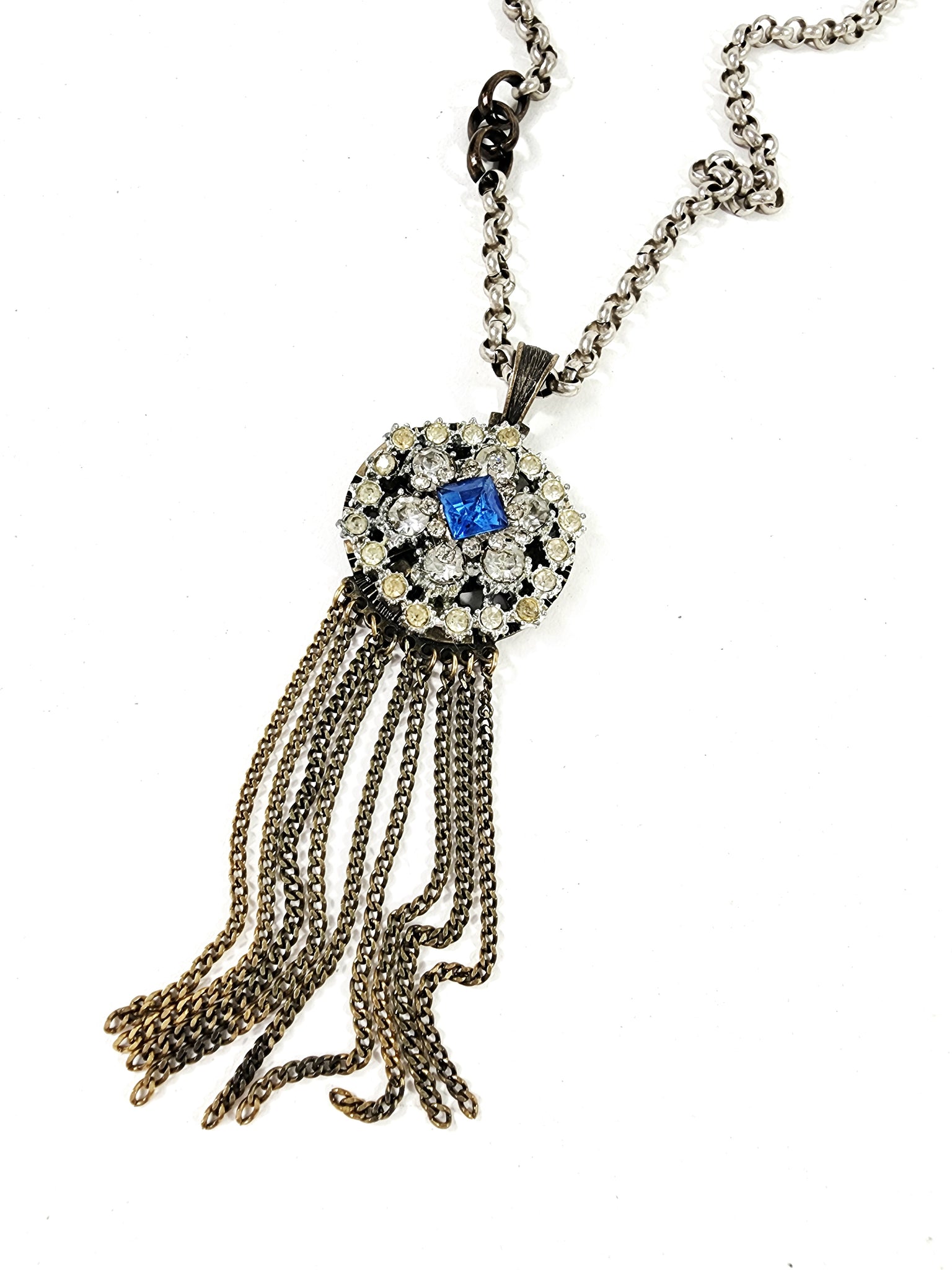 Vintage rhinestone pin with a touch of color. Chain fringe. Mixed metals