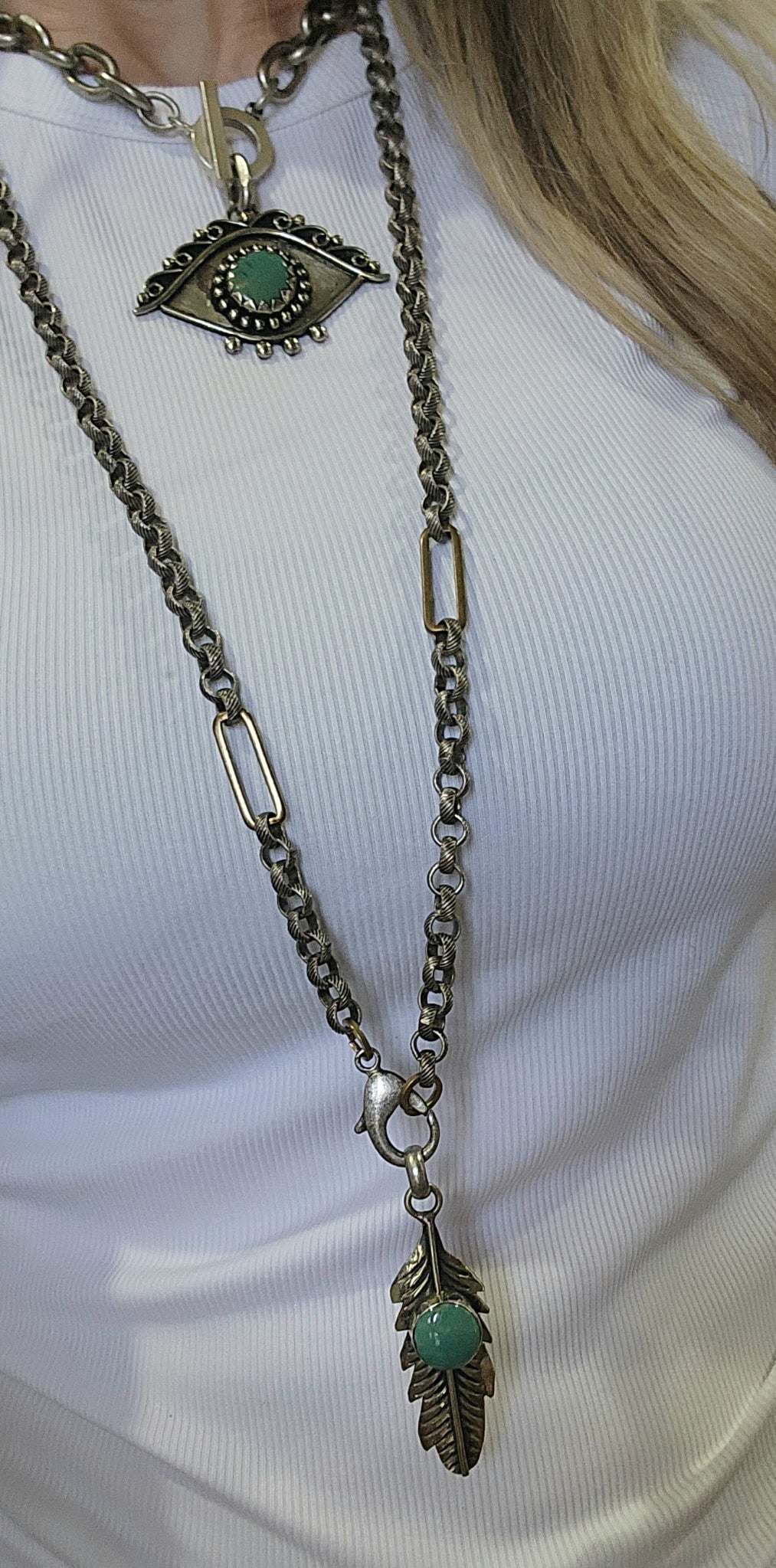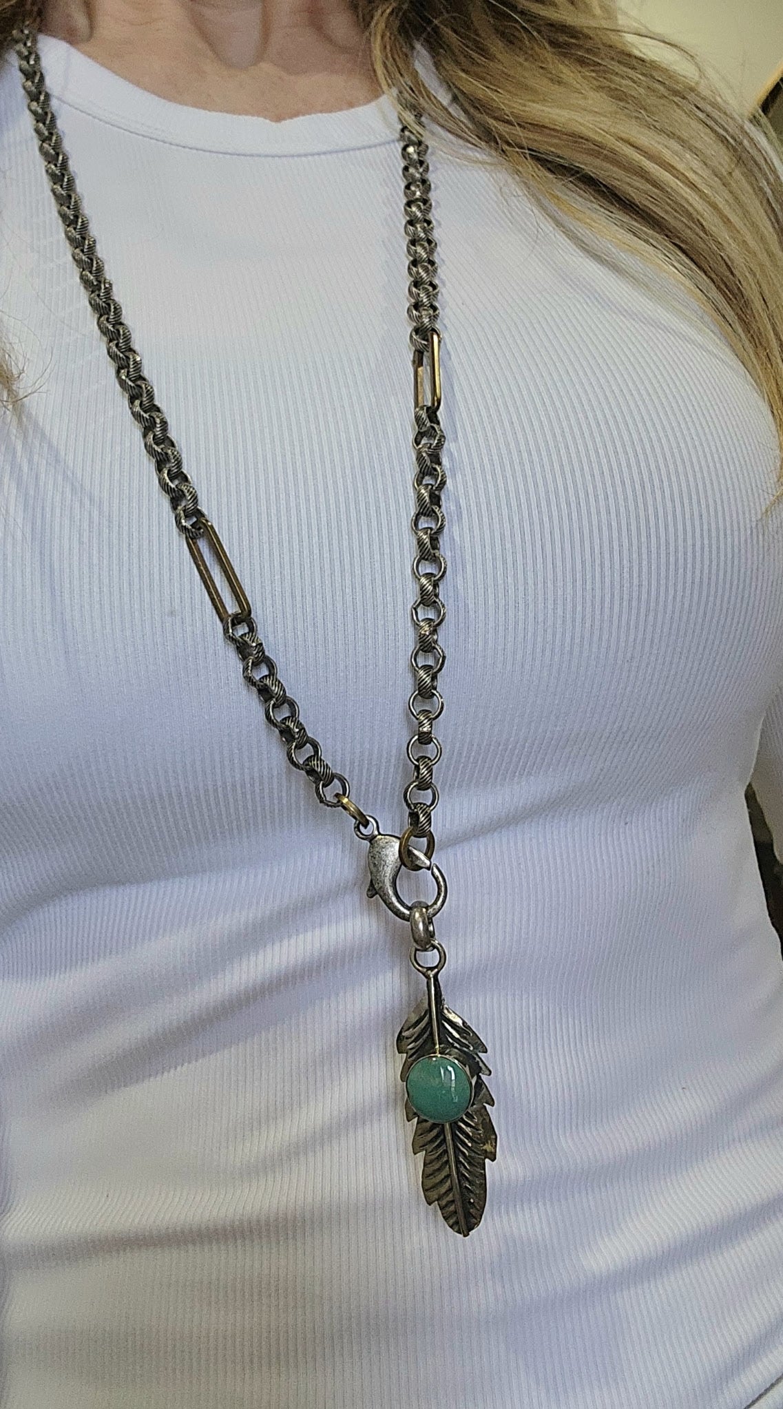 Multi link chain with removable silver/turquoise feather pendant