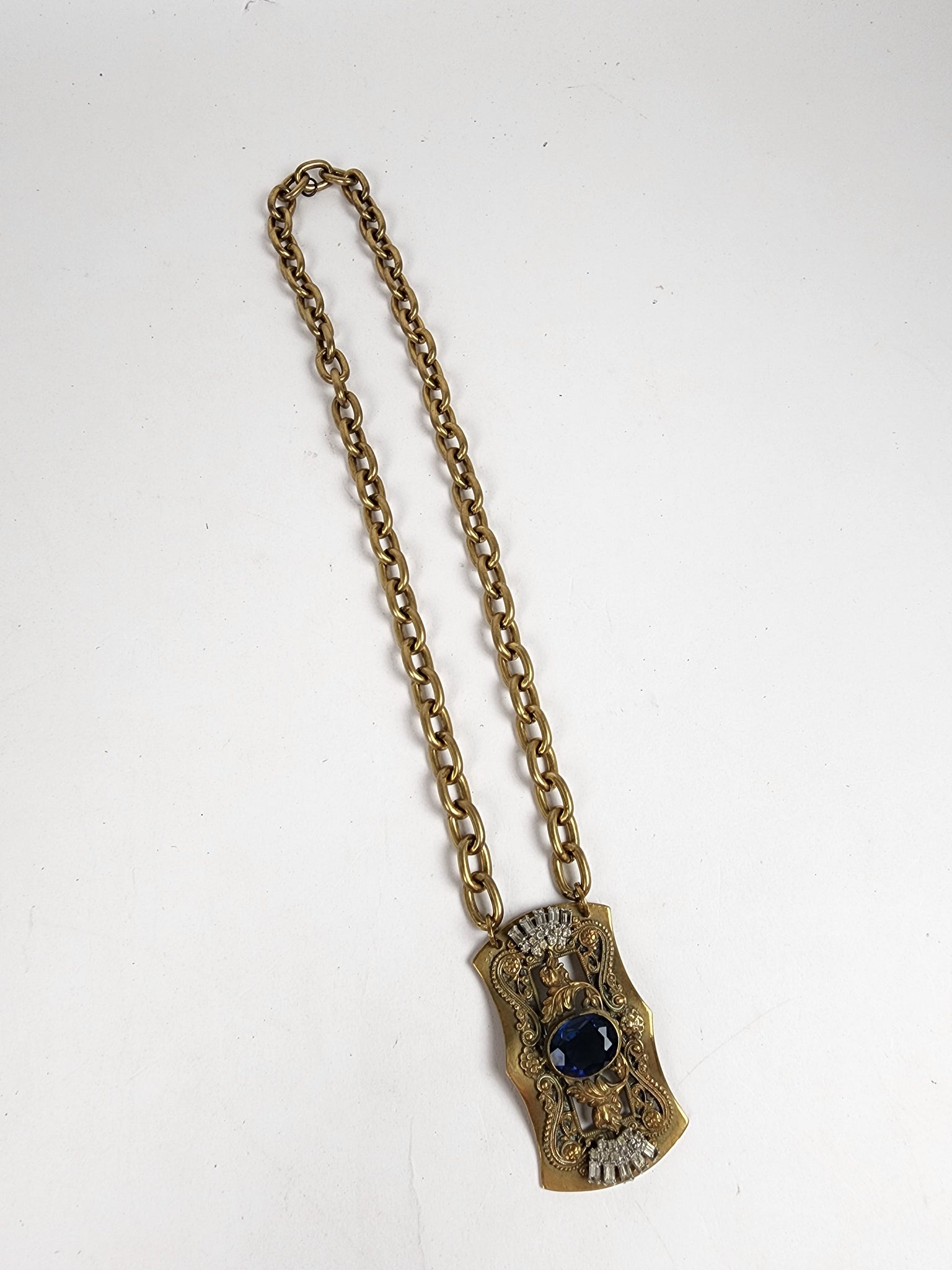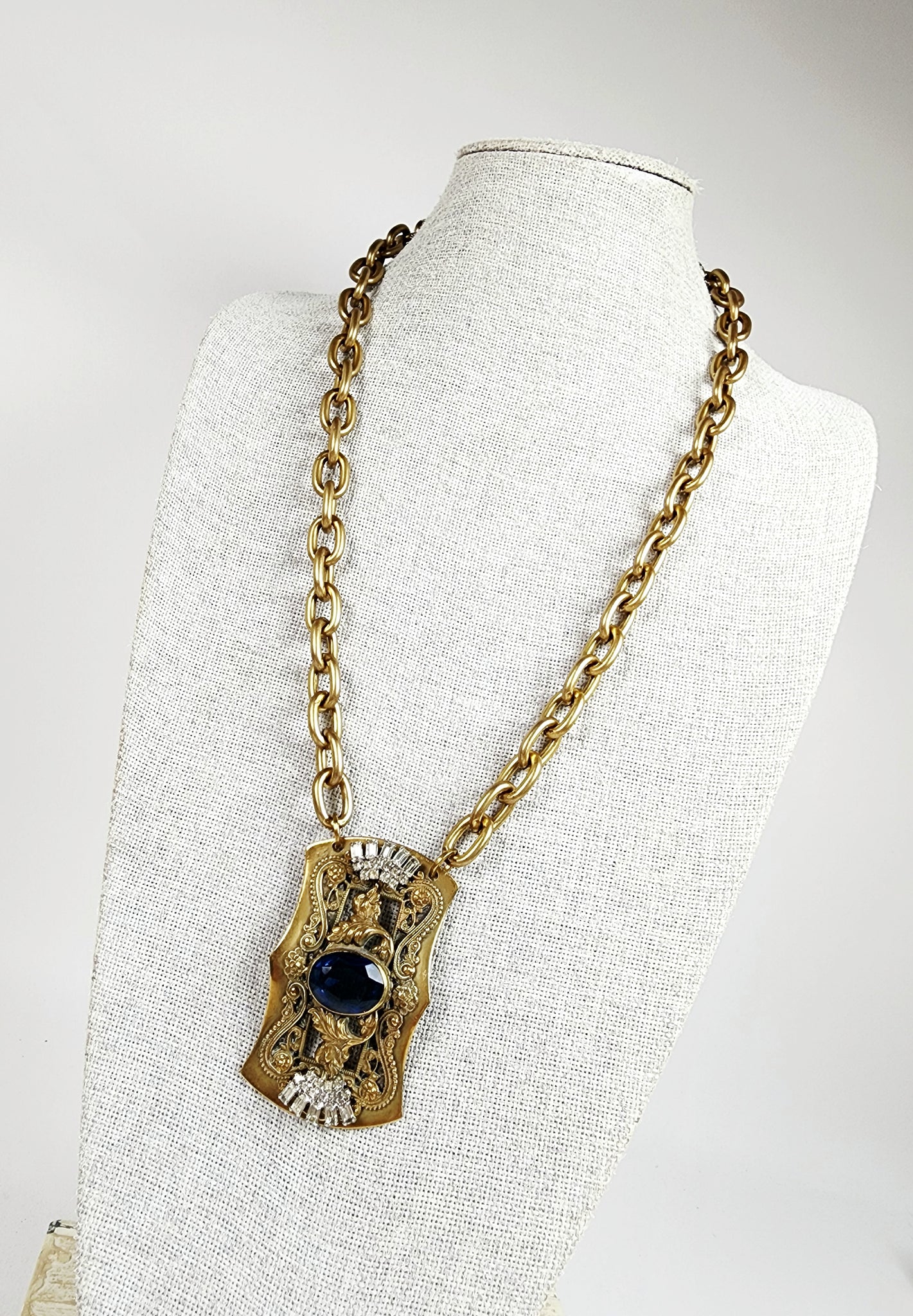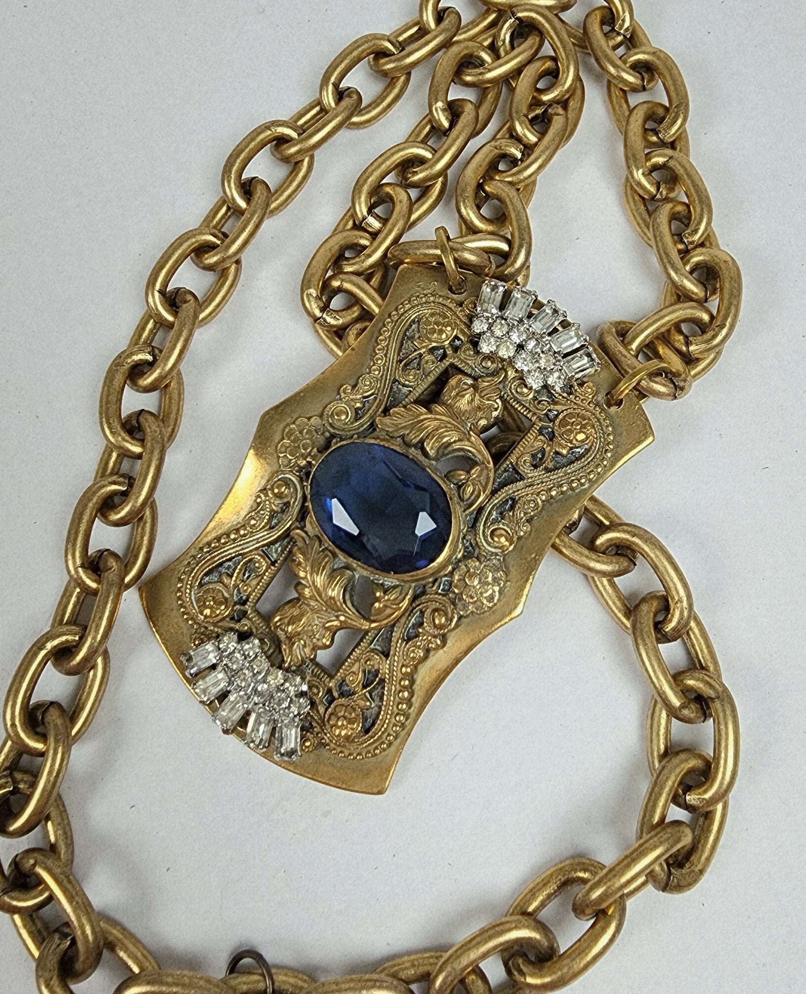 Gorgeous antique brass pin with blue crystal and rhinestones. Large, solid link chain. Edgy. Definitely one of Melody's favs!