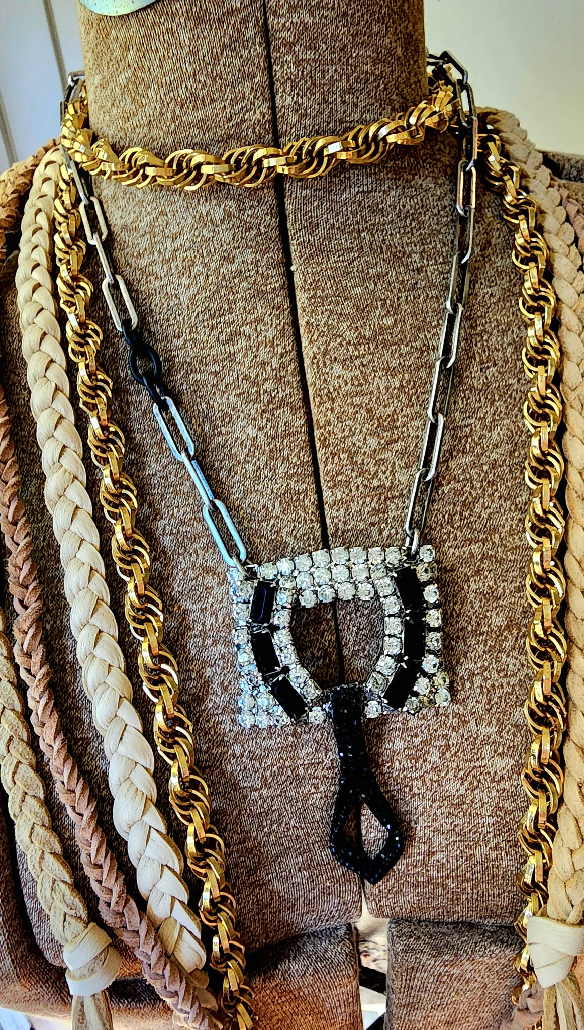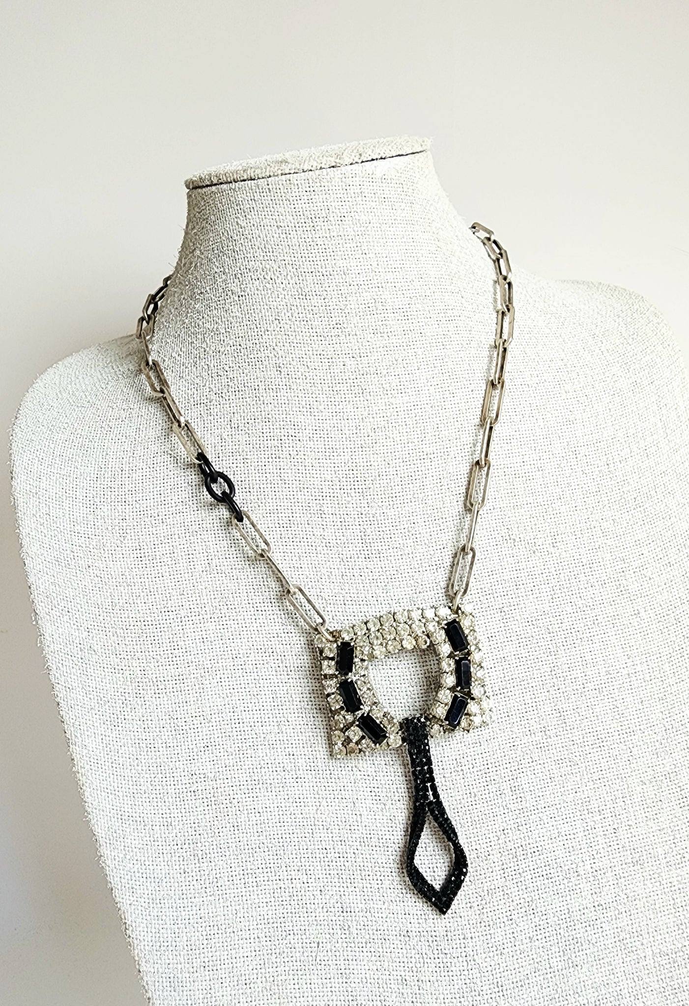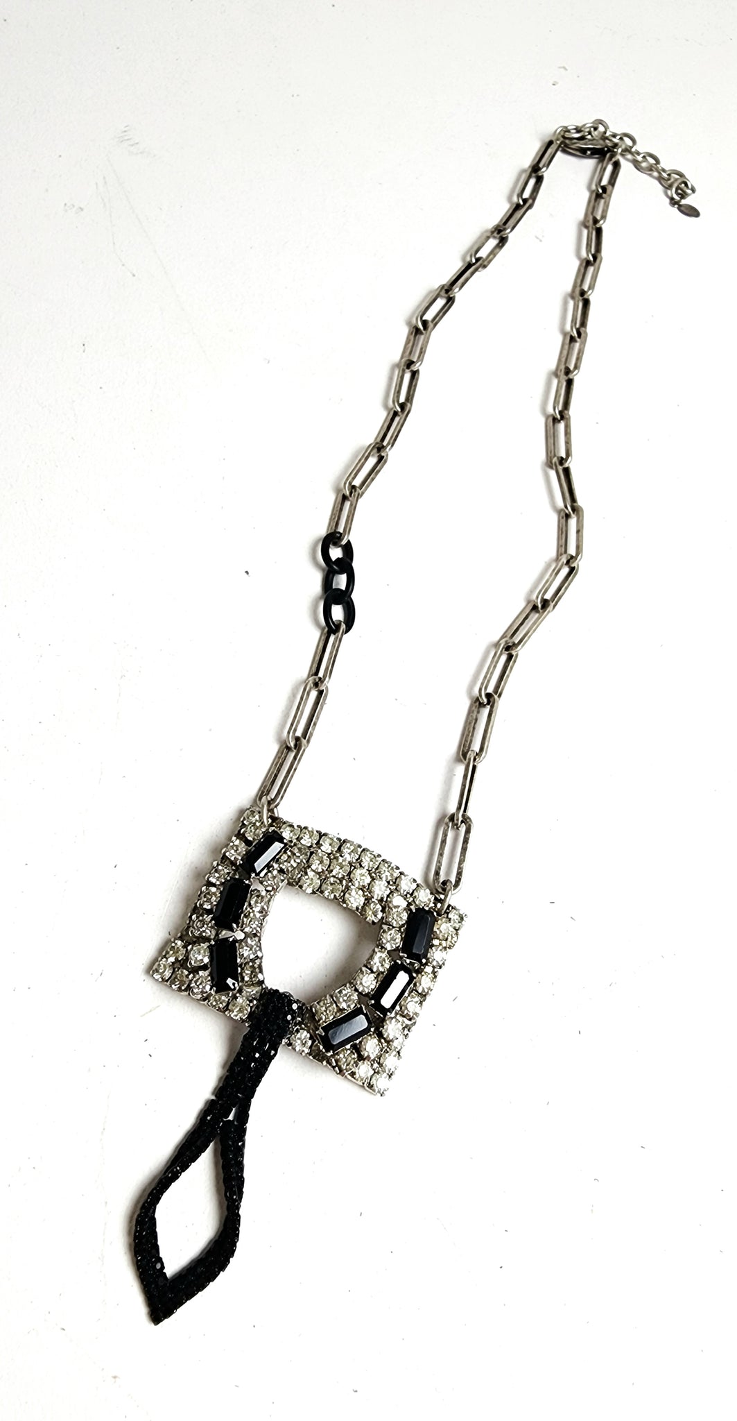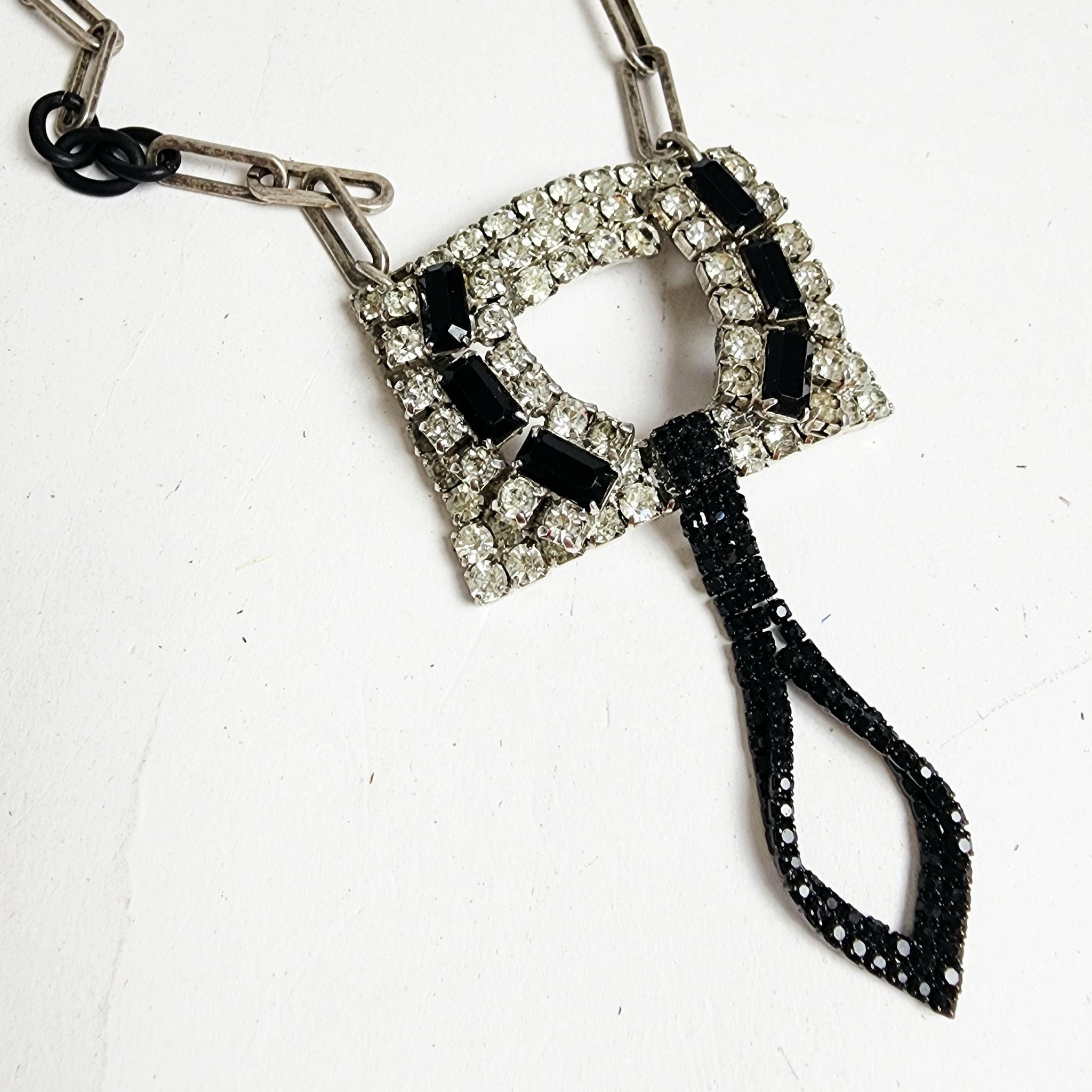 Vintage rhinestone shoe buckle with black crystals and tiny black crystals drop on a silver tone chain with black accent links.