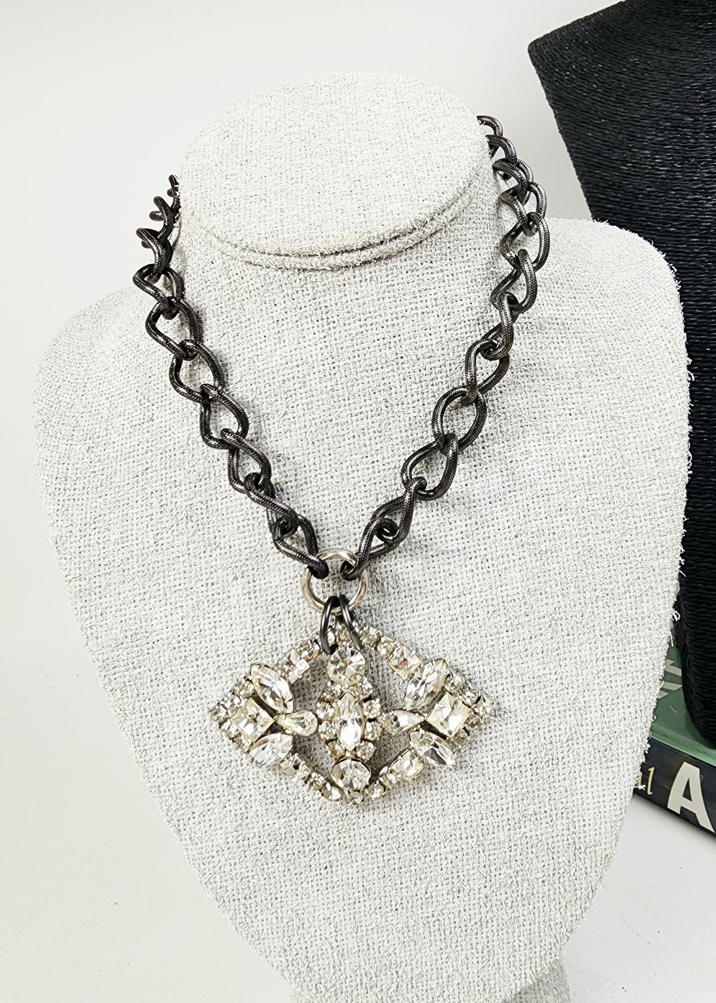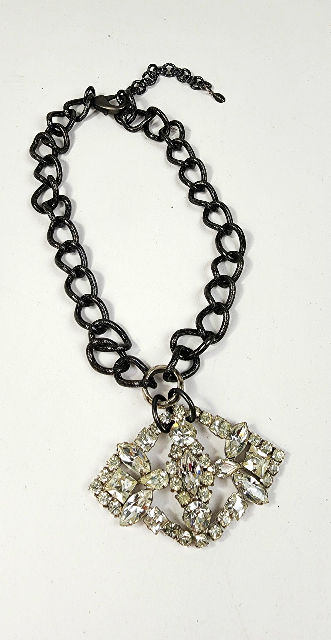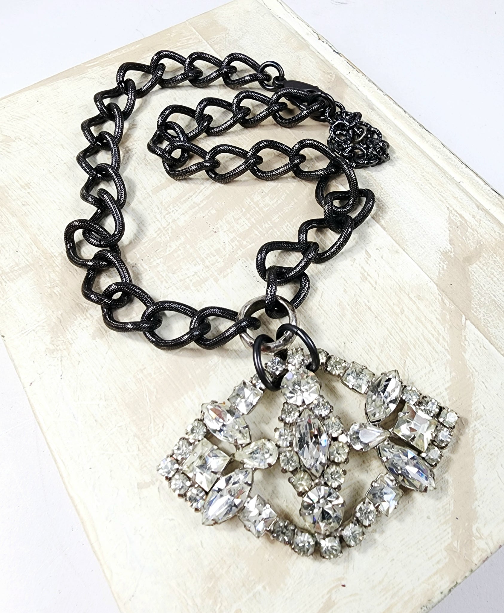 Beautiful vintage rhinestone brooch on gunmetal chain