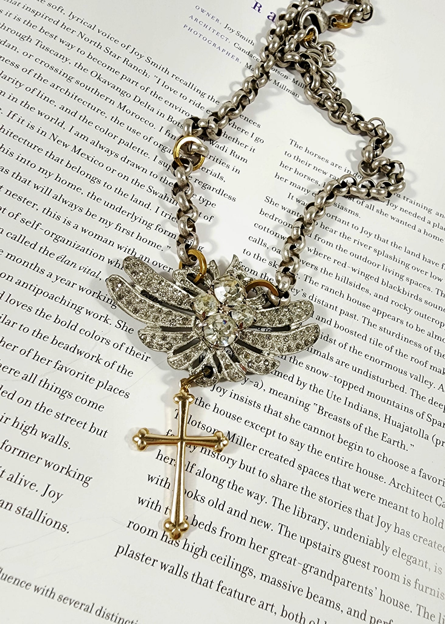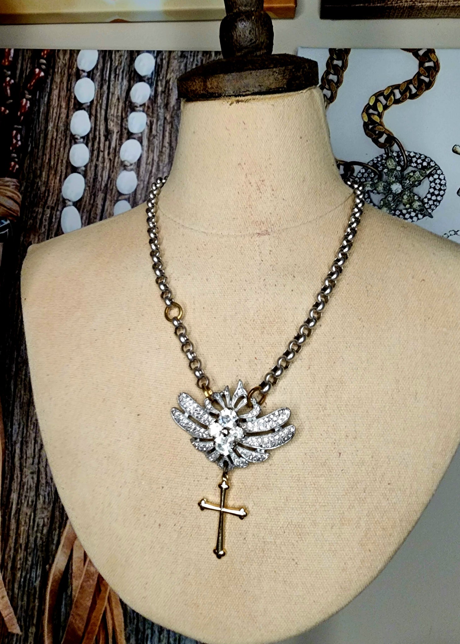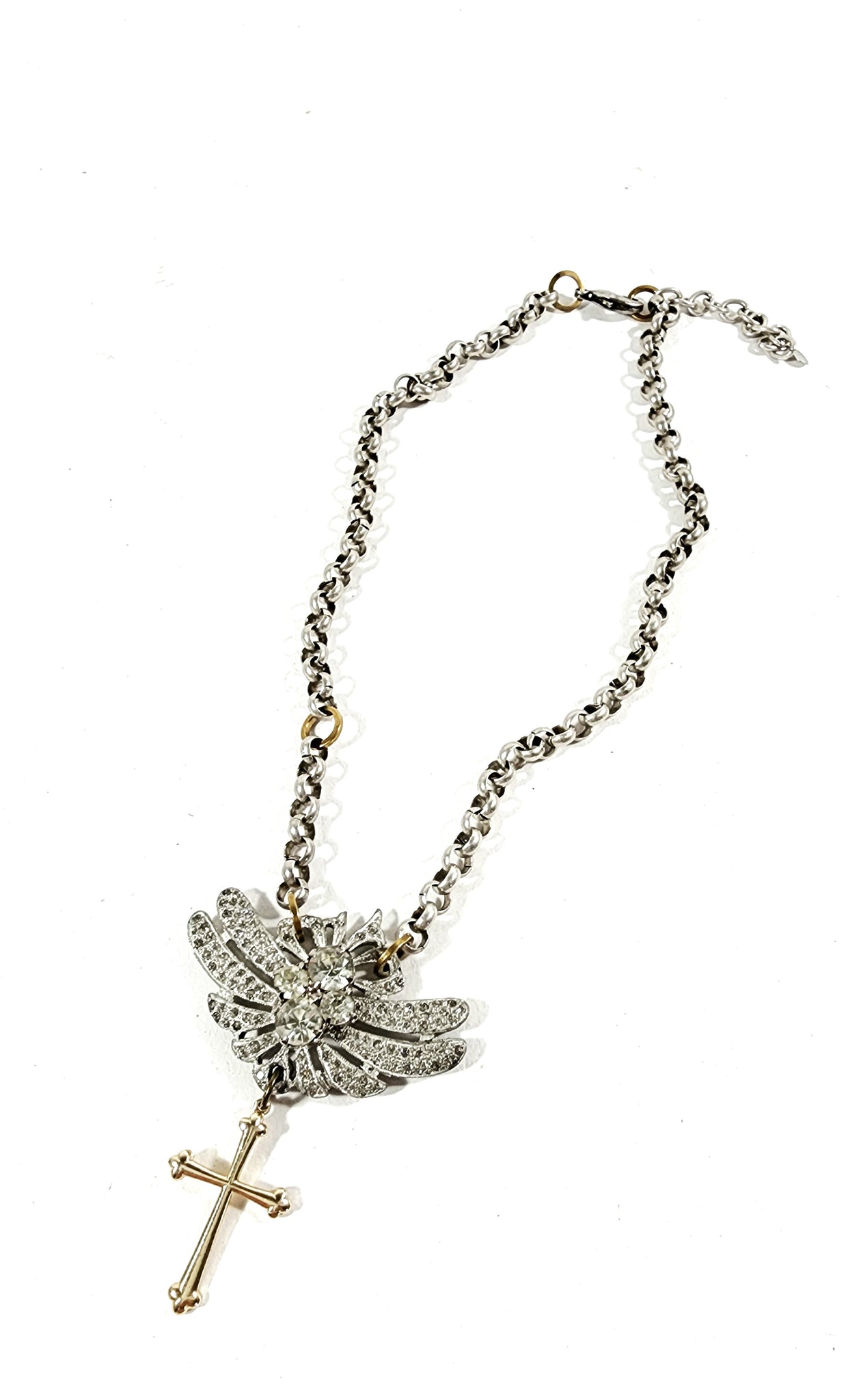 Vintage rhinestones on silver rolo chain with brass accents Gold tone cross