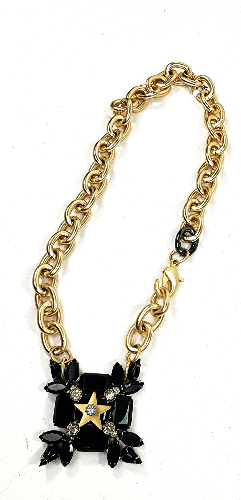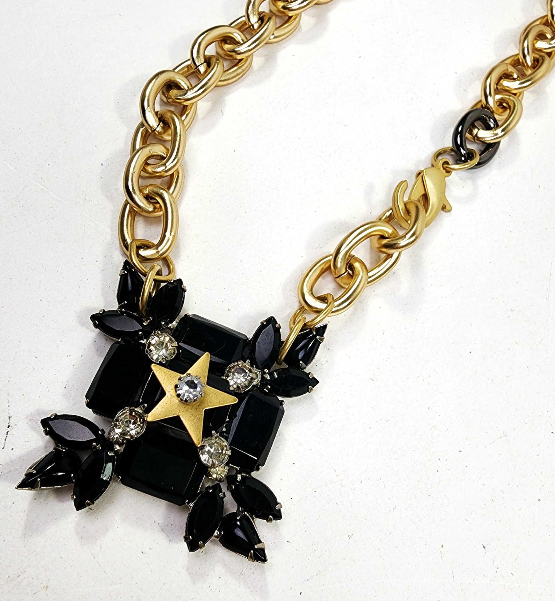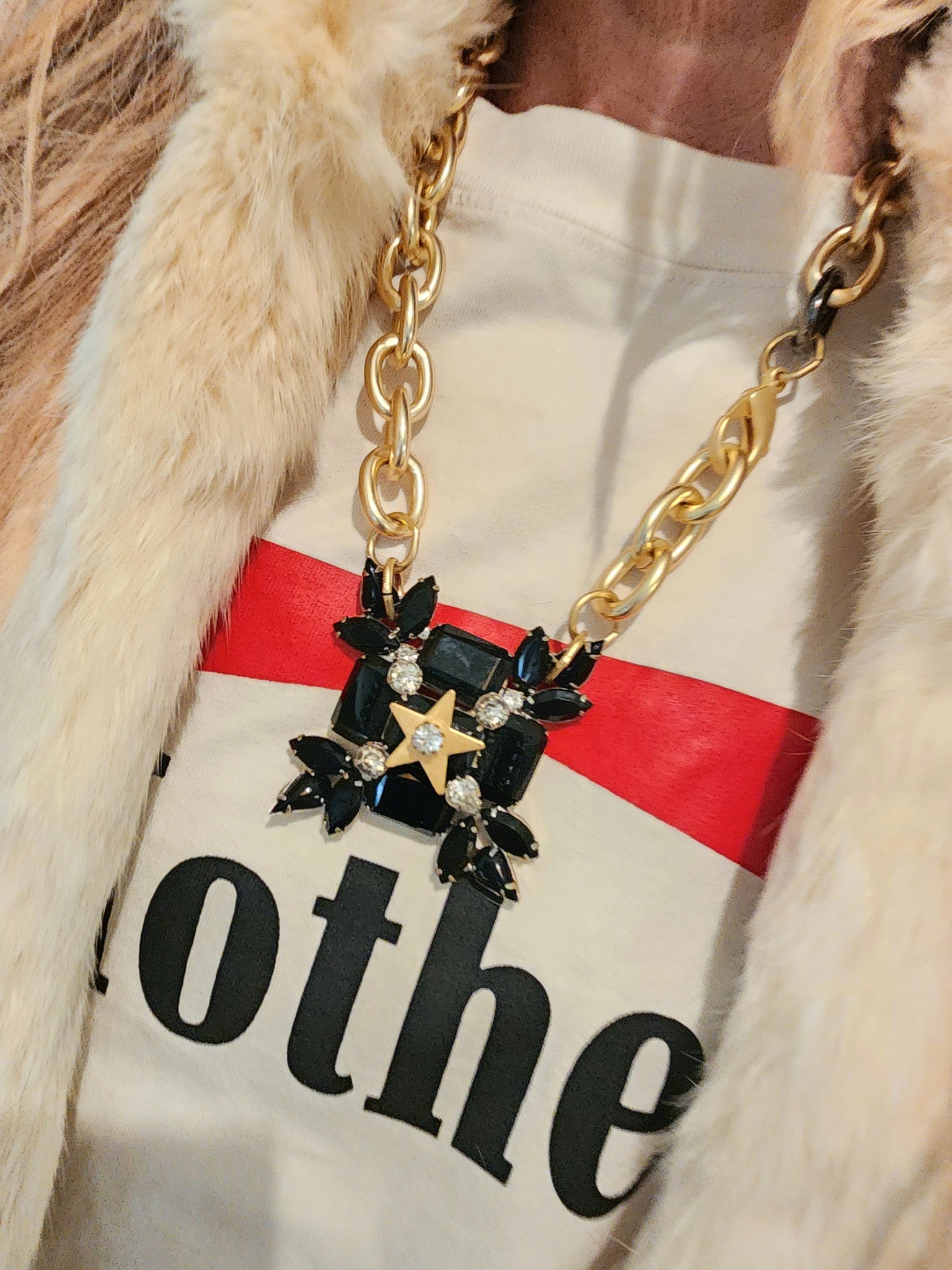Large link aluminum matte gold chain with vintage pin of large black crystals and clear rhinestones with a gold star accent to give it that bit of edge