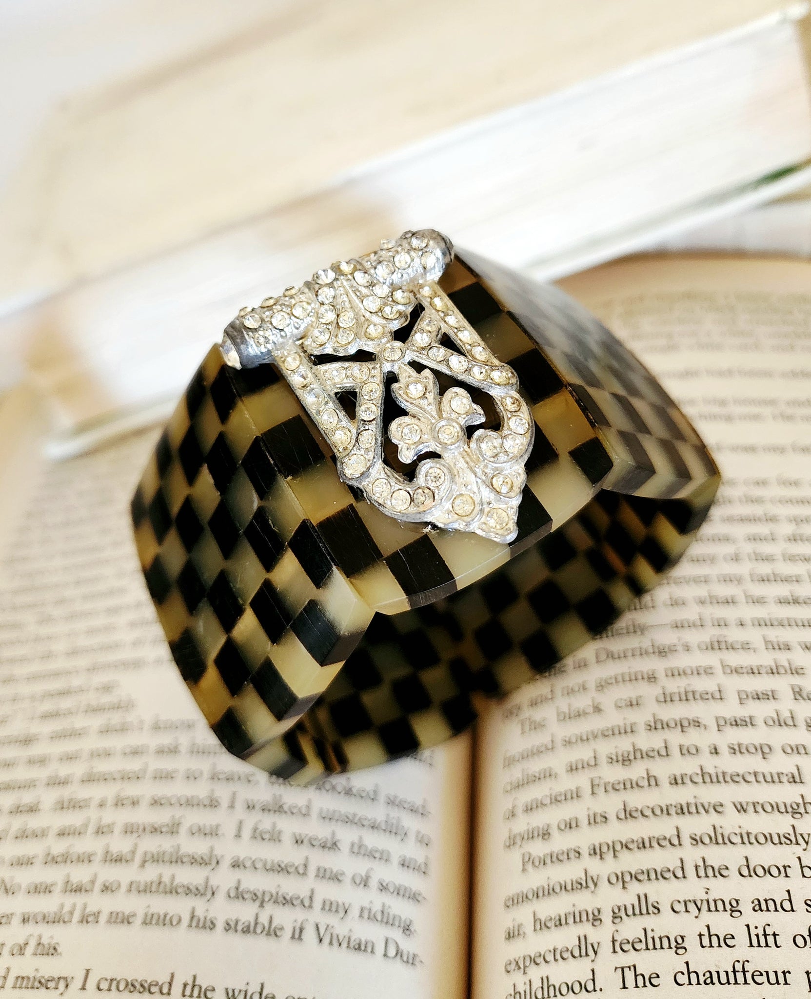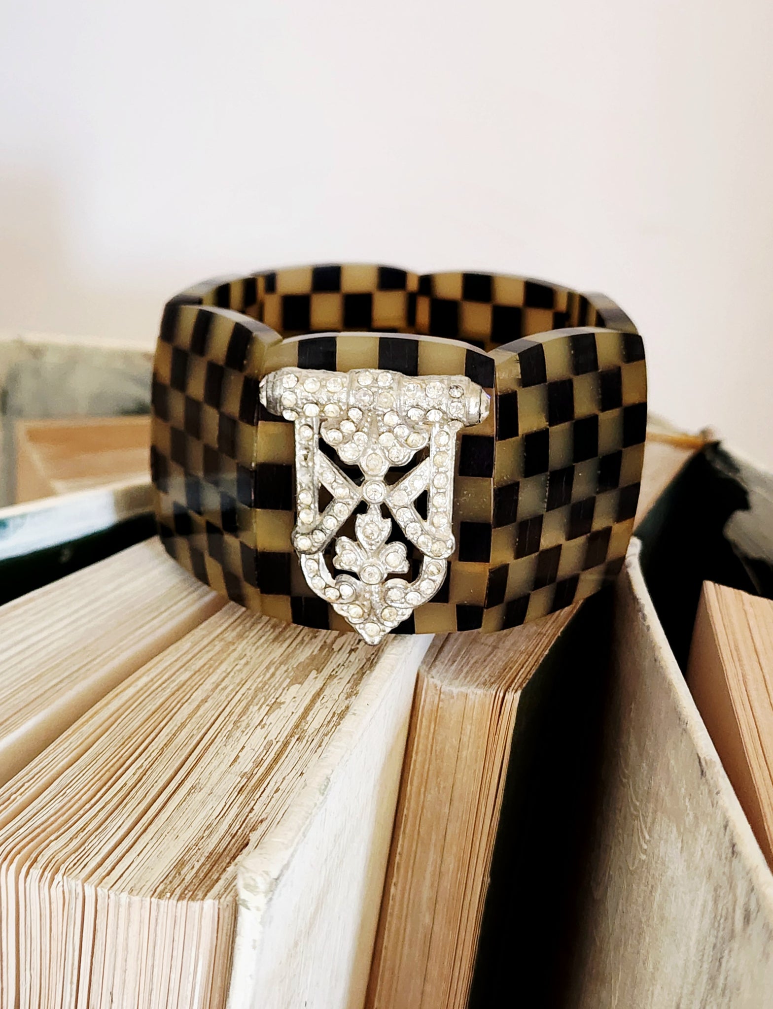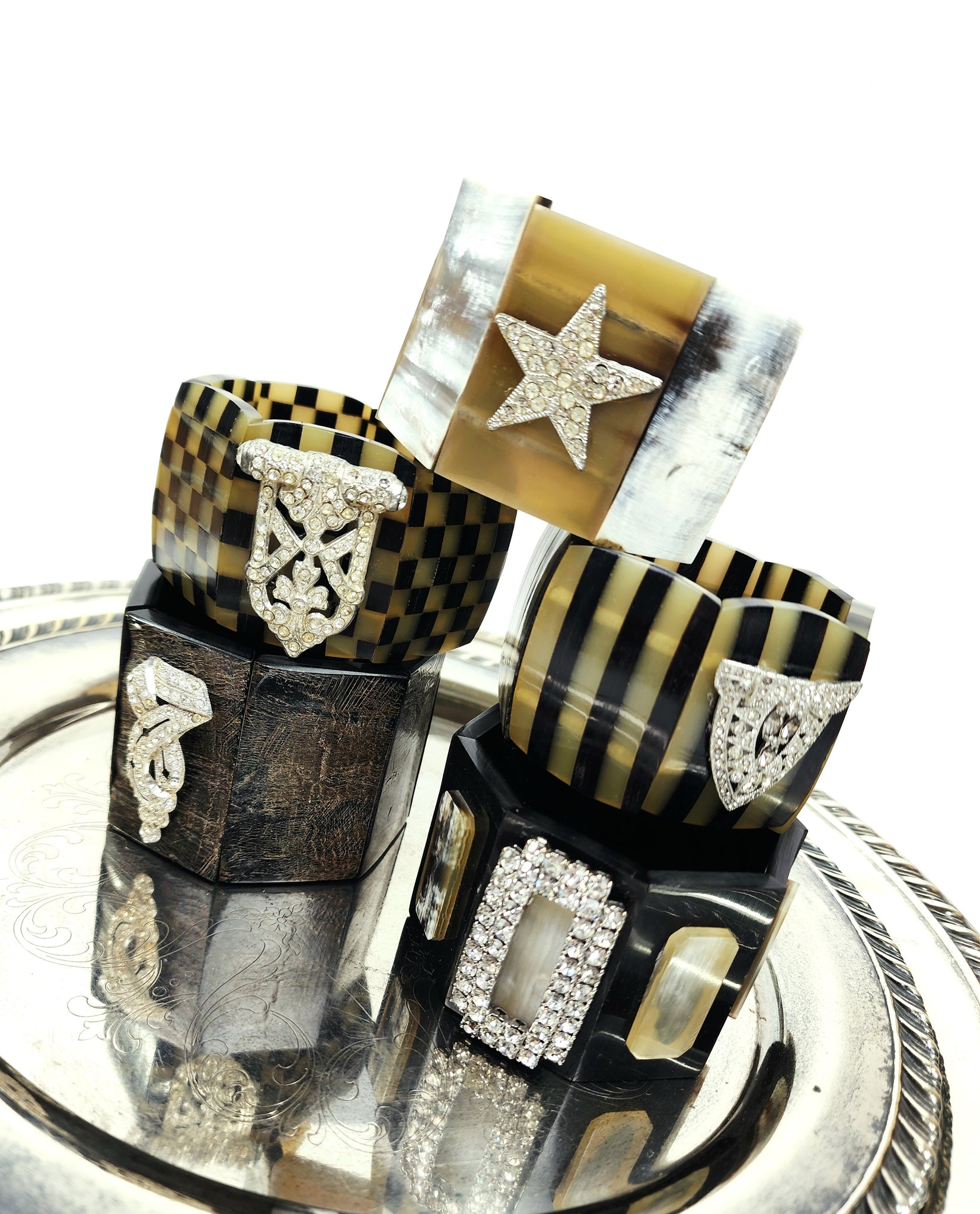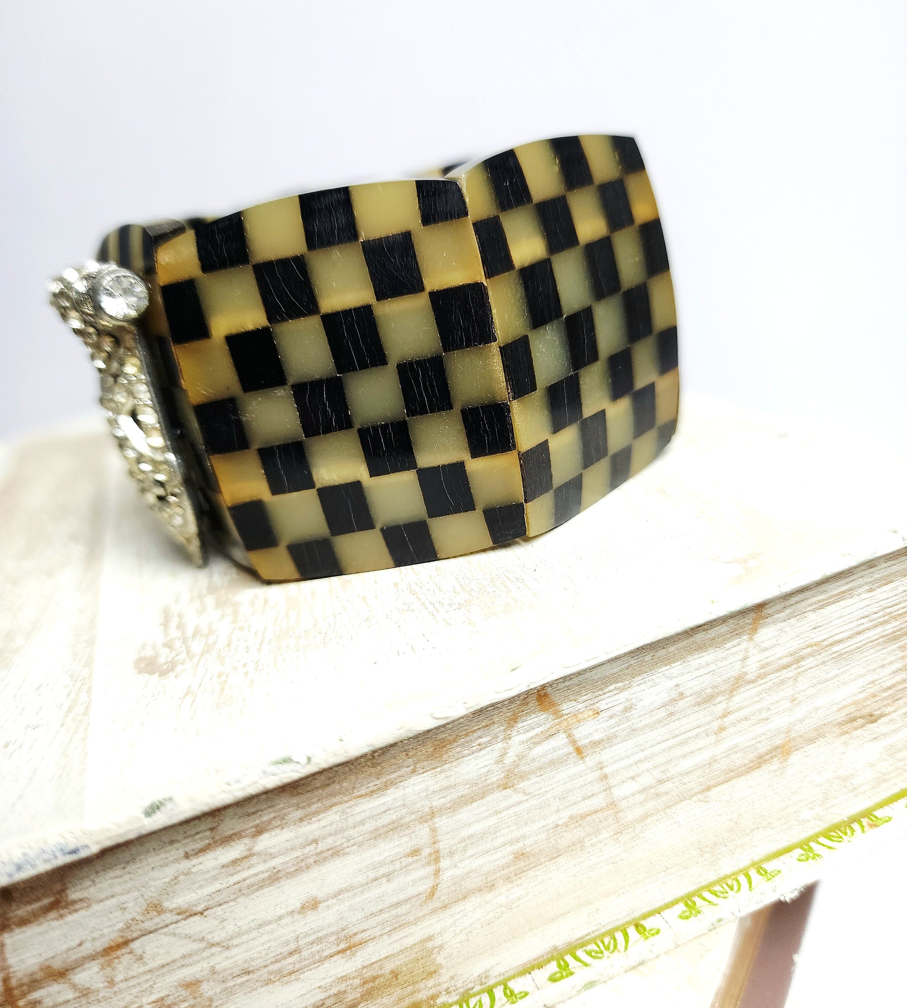 Horn stretchy band bracelet with a vintage rhinestone clip